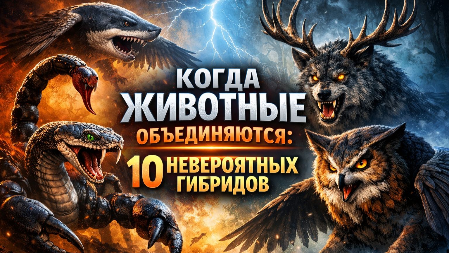 Что будет, если объединить самых опасных и величественных животных в одно существо? В этом видео ты увидишь 10 эпичных гибридов — от скорпиона и змеи до совы и лисы. Сначала — напряжённая встреча двух хищников, словно перед битвой. Затем — их невероятный гибрид. Кинематографичный свет, детализированные монстры и атмосферные сцены делают каждого гибрида по-настоящему захватывающим. Напиши в комментариях, какой гибрид получился самым мощным.