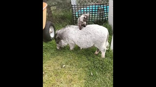 В Австралии один хвостатый, его имя не сообщается, подружился со свинкой. А вот как ее зовут – известно. Пятнышко. И теперь котик целыми днями катается на ее спине. Как видите, хрюшка спокойно жует травку и не обращает никакого внимания на своего наездника.