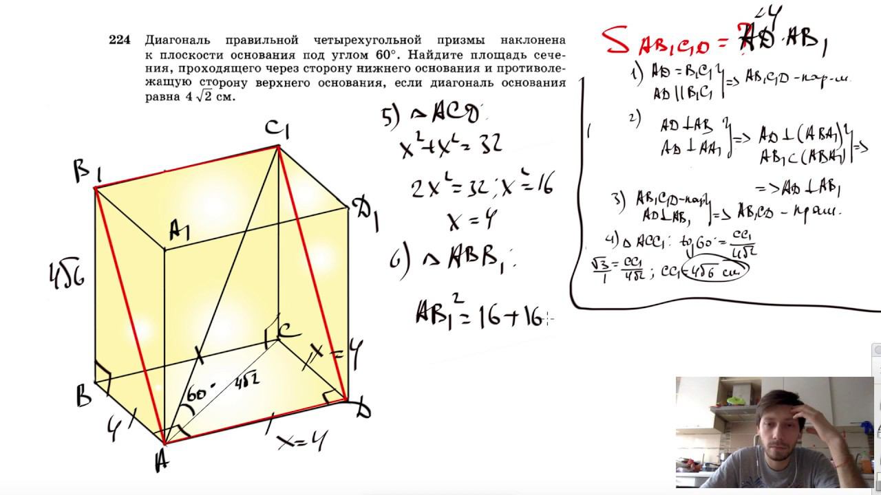 №224. Диагональ правильной четырехугольной призмы наклонена к плоскости основания под углом 60°. Найдите площадь сечения, проходящего через сторону нижнего основания и противолежащую сторону верхнего основания, если диагональ основания равна 4 √2 см. Поддержать канал рублём - 5469400944002125 (Сбербанк) Мой второй канал для подготовки к ЕГЭ и ОГЭ - https://www.youtube.com/ЕвгенийСумин Инстаграм - https://www.instagram.com/EGE_OGE.math Личный инстаграм - https://www.instagram.com/ee_sumin VK - https://vk.com/evgeniysumin FB - https://www.facebook.com/EvgeniySumin