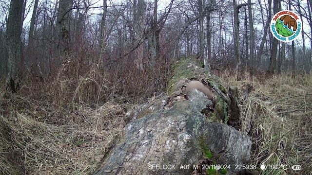 20.11.2024.Куница.Заповедник Большая Кокшага.Куница бежит по строму бревну и прячется