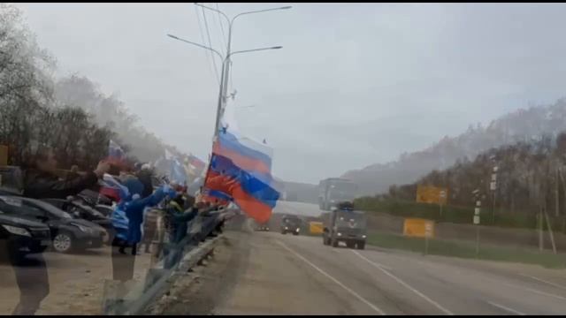 Люди встречают Российские войска возвращаются с Украины.