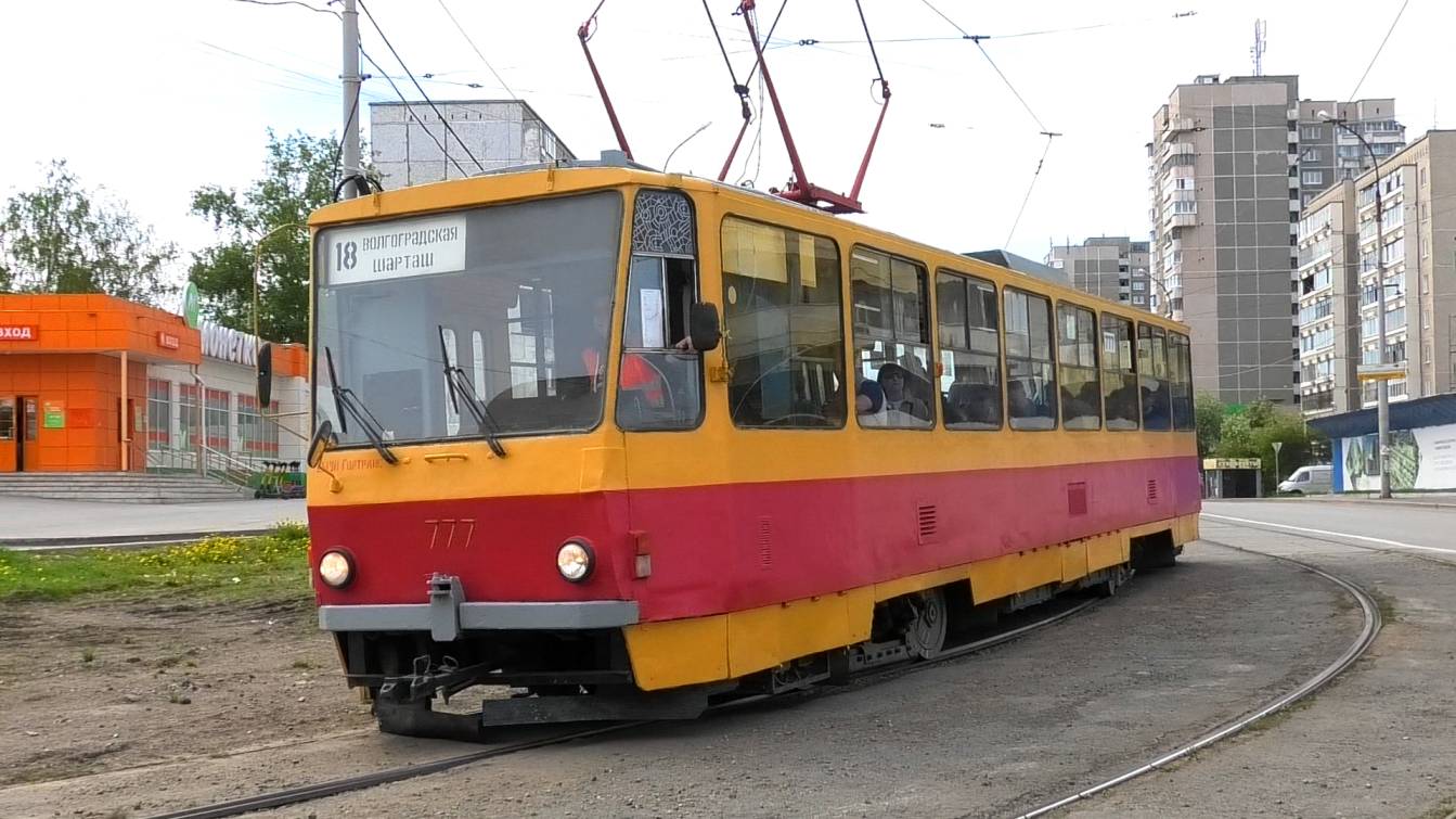 Трамвай Екатеринбурга Tatra T6В5SU СМЕ борт. №777 маршрут 18 следует по улице Викулова