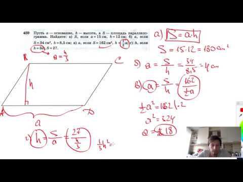 №459. Пусть а — основание, h — высота, a S — площадь параллелограмма. Найдите: a) S, если а=15см, h=12см; б) а, если S = 34 см2, h=8,5см; в) а, если S = 162cm2, h=½а; г) h, если h = 3а, S= 27. Поддержать канал рублём - 5469400944002125 (Сбербанк) Мой второй канал для подготовки к ЕГЭ и ОГЭ - https://www.youtube.com/ЕвгенийСумин Инстаграм - https://www.instagram.com/EGE_OGE.math Личный инстаграм - https://www.instagram.com/ee_sumin VK - https://vk.com/evgeniysumin FB - https://www.facebook.com/EvgeniySumin
