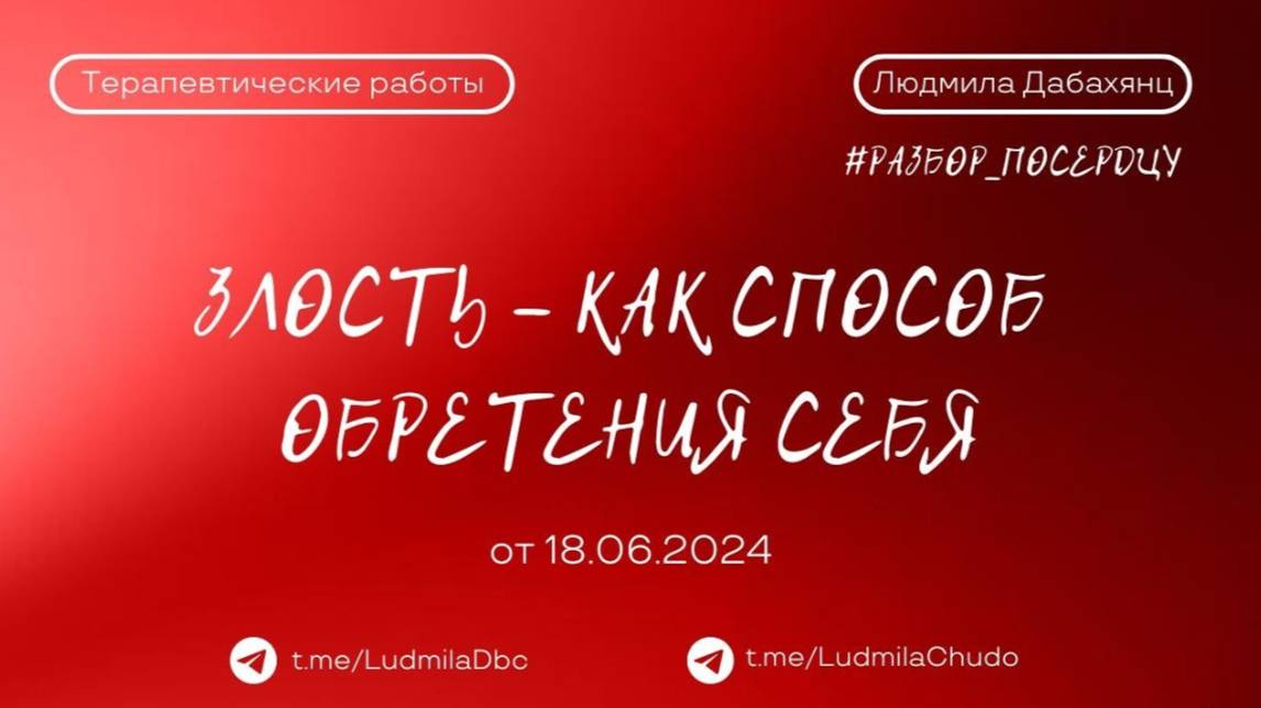 Запись эфира #разбор_поСердцу | Терапевтическая работа Рассмотрели несколько запросов ‼️ до встречи на следующей неделе, успевайте отправить заявку на участие в разборе, заявки на разбор принимаются лс - https://t.me/ludmiladbc Провела беседу: #просто_волшебница психотерапевт, целитель ЛЮДМИЛА ДАБАХЯНЦ Канал https://t.me/LudmilaChudo ‼️ канал #ТВОРЕЦ_СВОЕЙ_РЕАЛЬНОСТИ Подробнее: https://rutube.ru/plst/366415 2024 руб/месяц Заходите в бот - https://t.me/ludmiladbc_bot , если хотите участвовать ✓ Обязательно поставь 💗 ✓ Подпишись на канал ✓ И поделись с близкими Это будет вашим балансом за движение и получение энергии. Если есть желание создать баланс брать-давать... приму от всего сердца с благословением (донейшн) С Огромной Любовью, Дабахянц Людмила 💓 ✨ Telegram: https://t.me/ludmiladbc ✨ Канал в telegram “Я ЕСТЬ ТО, ЧТО Я ЕСТЬ”: https://t.me/LudmilaChudo ✨Онлайн-школа: https://ludmilachudo.skillspace.ru/school