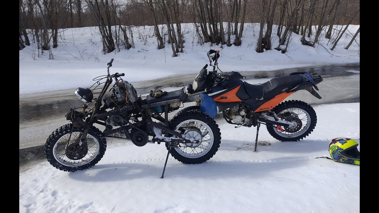 Зимние приключения на полноприводном мотоцикле с двигателем от бензопилы - сложное возвращение домой