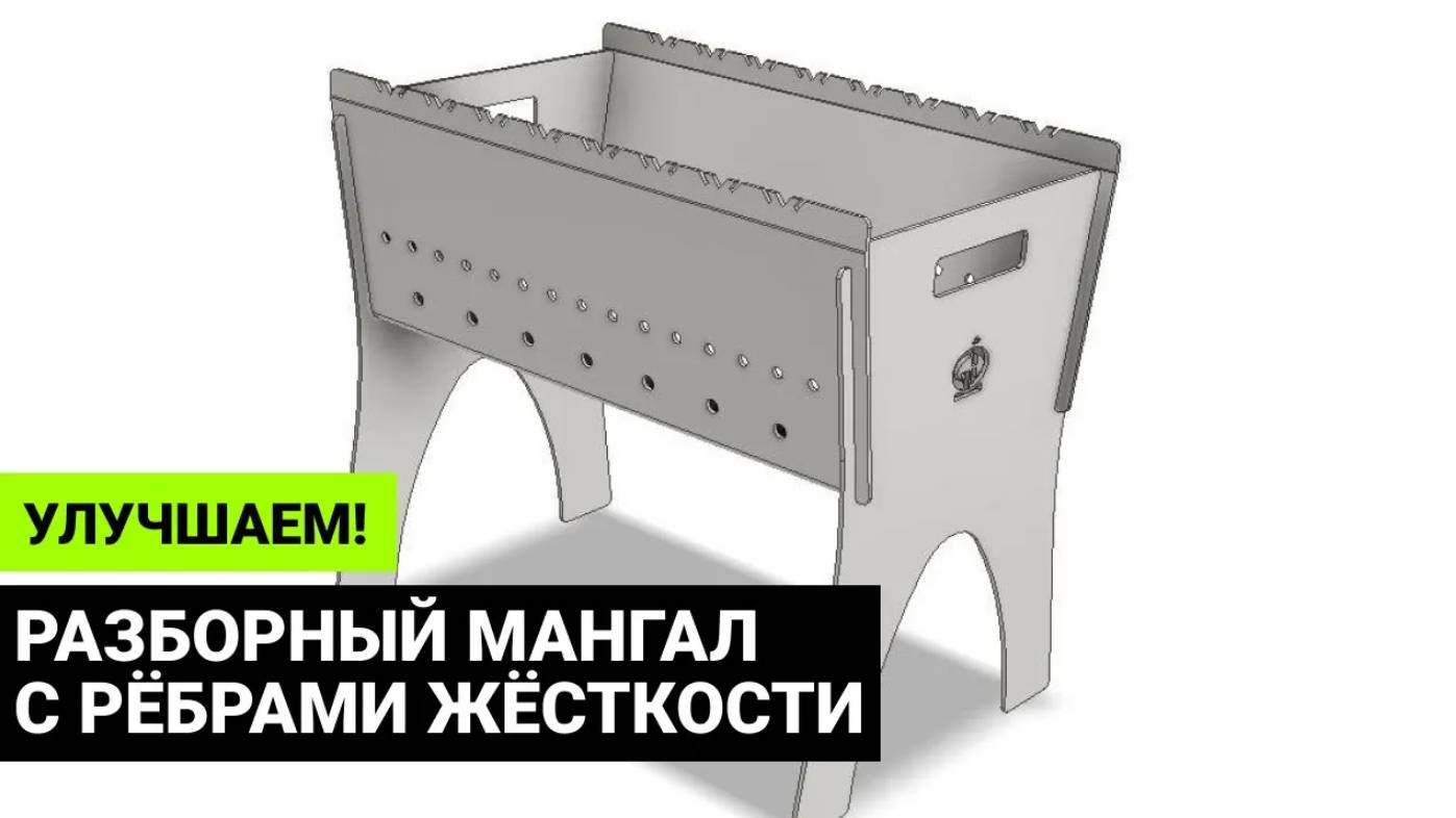 Металлический мангал с дополнительными рёбрами жёсткости сверху и снизу. Благодаря им при нагреве стенки мангала не изгибаются. Компактный, разборный, надёжный — можно возить с собой на пикники. Габариты: Высота — 410 мм Длина — 460 мм Ширина — 289 мм