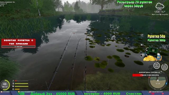 Поддержка донатом https://new.donatepay.ru/@1032463 Альтернативный донат https://www.donationalerts.com/r/kalyamba11 5536913964533059 карта Тинькоф Если стрим лагает,смотри стрим на трово https://trovo.live/s/Kalyamba_na_Ribalke Мой ВК - https://vk.com/kalyantv НИК в игре kalyan11 НАШ ДИСКОРД СЕРВЕР https://discord.gg/3ZeEDGs5h6 Заказ водоема на 1 час - 500р ( весь стрим 2500р ) Модерка на канале 1300р ( каждая следующая на 100р больше) ✅Призы в рулетке "ЗОЛОТАЯ" 500р ✔ ЗОЛОТО ✔ ПРЕМ ✔ КАТУШКИ РАПТОР 40, ВЕНГИ, ТАЙГА, СИЛЬВЕР 80, И другие ✔ ПАЛКИ ПИЛКЕРНАЯ, ДОНКА МОРСКИЕ, ✔ РОД ПОД, СТУЛЬЯ ✅Призы в рулетке СТАНДАРТ : 100р ✔ катушкИ РАПТОР 40, ВЕНГИ, ТАЙГА, СИЛЬВЕР 80, И другие ✔ катушки 60 для медного ( ЭВИИ, НАТОРЫ, ГОЛДА, и тд) ✔ ПИЛКЕРНОЕ УДИЛИЩЕ КОРОЛЕВА ОКЕАНА ✔ Морское Донное удилище ✔ прем ( 3, 7, 30 дней) ✔ золото ( 1, 3, 5, 10, 20 ,50) ✔ билет на море ( 1, 3, 5 дней) ✔ голд наживка и др. ✅Призы в рулетке "СТАРТОВАЯ" 50р ✔ катушка Венга ✔ катушка "silver80" ✔ катушка "БЕЛЫЙ КАЛИБР" ✔ катушка "Черный калибр" ✔ катушка "Протон" ✔ катушка "Нарга 6000" ✔ Набор Фидерист и спинингист ✔ Карповик Фортуна ✔ фидерные удилища ✔ прем, золото, алкашка, наживки и тд P.s Рулетка это не казино, а награда за поддержку стримера. Вечный ТОП ПОДДЕРЖКИ (10.06.2025) 1. Леха сварной 214 572 2. Dimon_pokemonchik 127 034 3. Skreb79 103 061 4. Interceptor 96 230 5. FishRus86 82 500