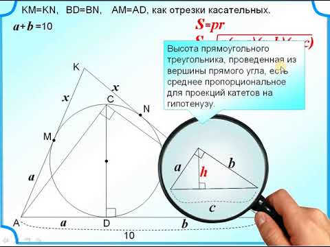 В прямоугольном треугольнике АВС с гипотенузой АВ, равной 10, на высоте СD как на диаметре построена окружность. Касательные к этой окружности, проходящие через точки А и В, пересекаются при продолжении в точке К. Чему равны касательные к окружности, выходящие из точки К?