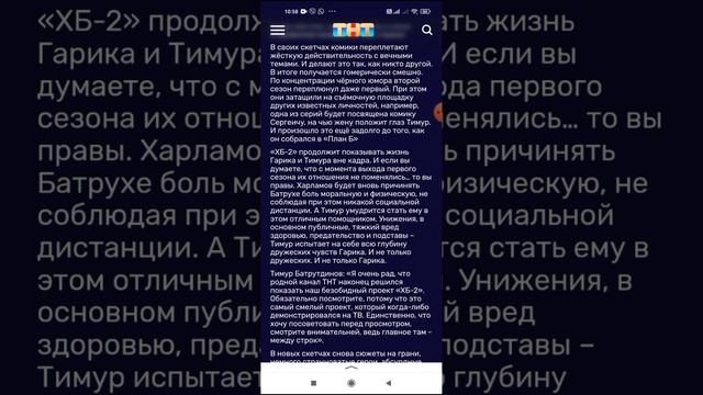 Самое жёсткое, самое смешное и самое откровенное комедийное шоу страны! В своих скетчах комики переплетают жёсткую действительность с вечными темами. И делают это так, как никто другой. В итоге получается гомерически смешно. По концентрации чёрного юмора второй сезон переплюнул даже первый. При этом они затащили на съёмочную площадку других известных личностей, например, одна из серий будет посвящена комику Сергеичу, на чью жену положит глаз Тимур. И произошло это ещё задолго до того, как он собрался в «План Б» «ХБ-2» продолжит показывать жизнь Гарика и Тимура вне кадра. И если вы думаете, что с момента выхода первого сезона их отношения не поменялись… то вы правы. Харламов будет вновь причинять Батрухе боль моральную и физическую, не соблюдая при этом никакой социальной дистанции. А Тимур умудрится стать ему в этом отличным помощником. Унижения, в основном публичные, тяжкий вред здоровью, предательство и подставы – Тимур испытает на себе всю глубину дружеских чувств Гарика. И не только дружеских. И не только Гарика. Тимур Батрутдинов: «Я очень рад, что родной канал ТНТ наконец решился показать наш безобидный проект «ХБ-2». Обязательно посмотрите, потому что это самый смелый проект, который когда-либо демонстрировался на ТВ. Единственно, что хочу посоветовать перед просмотром, смотрите внимательней, ведь главное там - между строк». В новых скетчах снова сюжеты на грани, немного странноватые герои, абсурдные решения и качественная картинка – всё в лучших традициях. Гарик и Тимур познакомят нас с совершенно новыми персонажами: детективом Батруччо, Человеком-Справедливостью, семейством Мухиных, проктологами-контрабандистами, суперагентом Бомжом 0.5, русскими полярниками и их норвежскими коллегами, Робоментом и многими другими! АКТ¦РСКИЙ СОСТАВ Тимур Батрутдинов, Гарик Харламов АКТЕРЫ И ГЕРОИ
