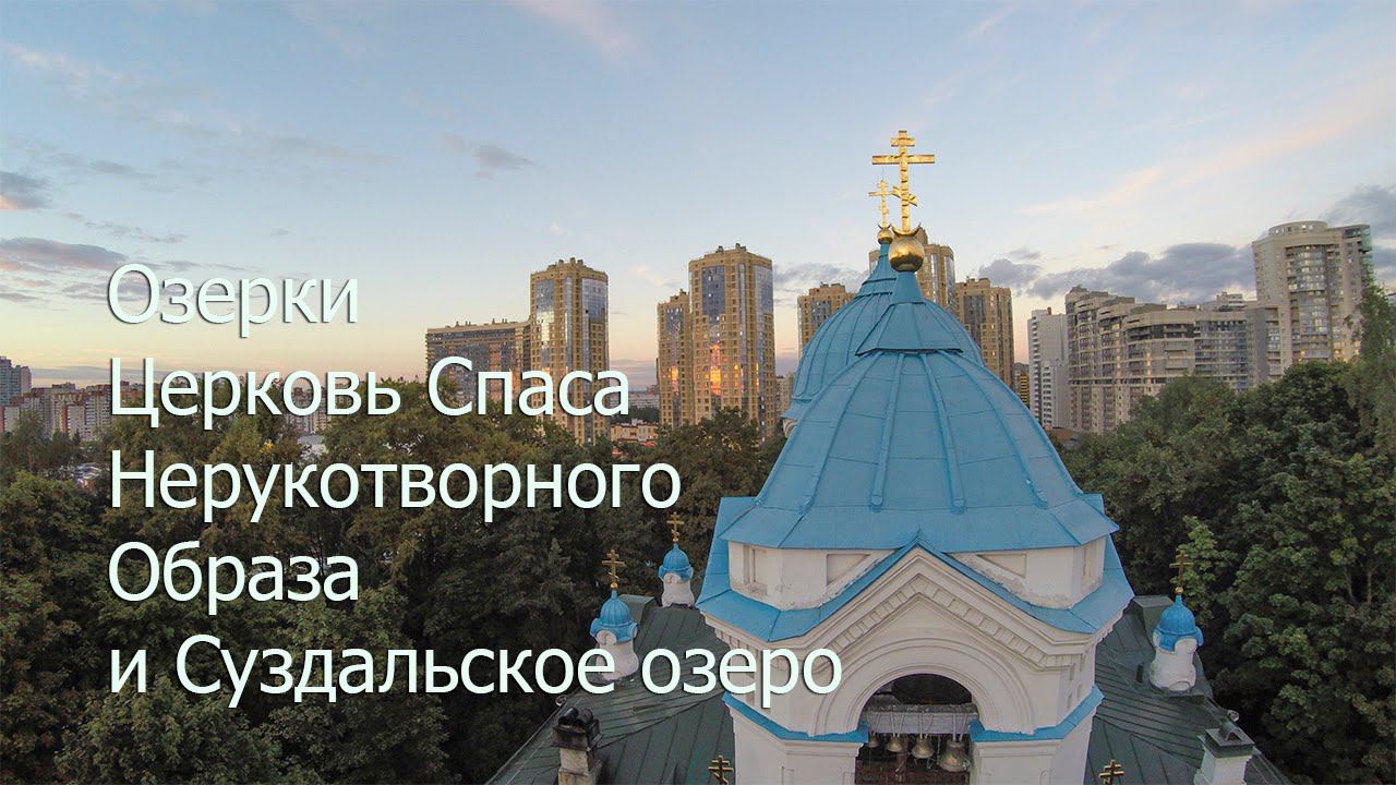 Аэросъемка. Озерки, церковь Спаса нерукотворного образа и Суздальское озеро.