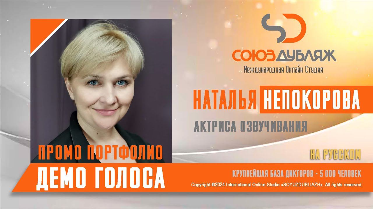 #СоюзДубляж #БазаДикторов #Озвучка ✔️Наталья Непокорова, актриса озвучивания. Международная Онлайн-Студия "СОЮЗДУБЛЯЖ" - профессиональная озвучка и дубляж. ▪️Рабочая группа в Телеграм: https://t.me/soyuzdubliazh ▪️Контакт для связи: https://t.me/SoyuzAdmin ▪️Подпишись:https://www.youtube.com/c/SOYUZDUBLIAZH ▪️Сайт: https://www.soyuzdubliazh.com/ Лучшие голоса для вашей аудиорекламы и видеороликов. База дикторов - 5 000 человек, профессионального уровня на ENG| FR| TR| RU| ISR| AZ| UA| KZ| UZ| языках. Мужские и Женские топовые голоса для озвучки любых проектов, таких как: Рекламы, Презентации, Фильмы, Сериалы, Игры, Мультфильмы, ТВ Шоу, Аудио-видео визитки. ✔️Сотрудничая с нами вы получаете свой проект под ключ, не выходя из дома или офиса. Наша слаженная команда из лучших дикторов, актёров озвучивания, режиссёров и звукорежиссёров в кратчайшие сроки озвучат или отдублируют ваш заказ на профессиональном уровне. Образцы работ нашего портфолио вы сможете посмотреть на канале СОЮЗДУБЛЯЖ. ВНИМАНИЕ: ✔️Мы приглашаем специалистов озвучки к сотрудничеству в нашей команде. Вы можете пройти по ссылке в наш телеграм канал и связаться с Админом для обсуждения. ✔️Всем заказчикам подобных медиа проектов по озвучки и дубляжу фильмов, сериалов, документалок обращаться непосредственно к Админу Телеграм группы СОЮЗДУБЛЯЖ, пройдя по ссылке: Проходи по ссылке: https://t.me/soyuzdubliazh International Online-Studio SOYUZDUDLIAZH presents a highly professional approach in voice-over and dubbing. ▪️Our working group https://t.me/soyuzdubliazh ▪️Chief manager https://t.me/SoyuzAdmin ▪️Follow https://www.youtube.com/c/SOYUZDUDLIAZH ▪️Web: https://www.soyuzdubliazh.com/ We offer You the best Voices for your Audio commercials and Video`s. Our Database contains over 5 000 voices of native speakers and high-class foreign language specialists in ENG| FR| TR| RU| ISR| AZ| UA| KZ| UZ|. Male & Female top level voices for all the variety of dubbing projects such as commercials, presentations, movies, TV-series, video and computer games, cartoons, TV-shows, audio & video portfolio’s – all in one place. As your business partner we guarantee a turn-key project without you leaving your house or office. Our target is to make sure that the dubbing of your project is made as quick as possible by a well-coordinated and professional team of the best speakers, film and sound directors. To whom it may concern! We invite dubbing specialists to join our team. Please contact our manager on Telegram https://t.me/soyuzdubliazh