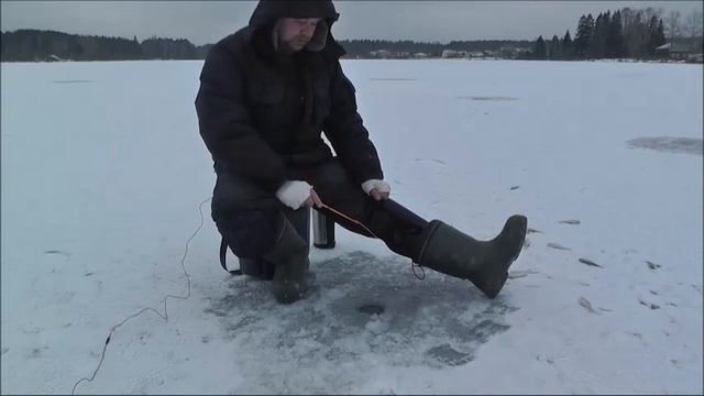 Рыбалка по первому льду на маленьком сельском пруду близ Екатеринбурга.