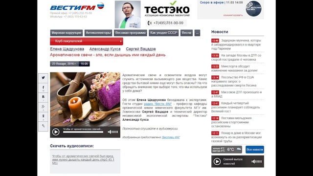 Ароматические свечи и освежители воздуха могут служить источником вызывающего рак вещества. Какие средства бытовой химии еще могут быть опасны? На что обращать внимание при выборе того, что мы используем у себя дома? Гости студии радио "Вести ФМ" - профессор кафедры органической химии химического факультета МГУ им. Ломоносова Сергей Вацадзе и технический директор независимой экологической экспертизы ТЕСТЭКО - Александр Кукса.