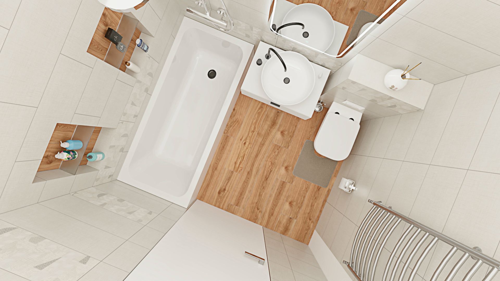 Плитка под ткань с абстрактным декором. На стене над ванной ниши расположены на разных расстояниях от угла. Это подтолкнуло отказаться от симметрии. Над ванной плитка уложена с отступом в половину. Декоры размещены хаотично по трем стенам.