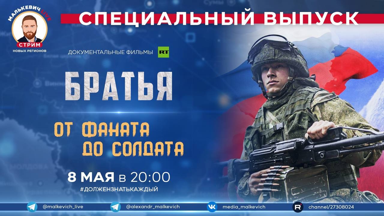 В рамках спецрубрики #ДолженЗнатьКаждый мы познакомим вас с двумя фильмами документального телеканала RTД. (https://t.me/rtdru) ▪ Документальный фильм «Братья». Герои этого фильма — российские мужчины, которые оставили мирные профессии, семьи, чтобы стать добровольцами и пойти воевать в зоне СВО. Средний возраст бойцов — от 30 до 50 лет, у одних есть за плечами боевой опыт, другие не служили в армии, но всех объединяет желание защищать Родину. Авторы фильма побывали в учебных центрах добровольческих батальонов «Тигр» в Приморье, «БАРС-16» в Ставропольском крае и батальона имени Салавата Юлаева в Башкортостане, где увидели, как вчерашние строители, агрономы, программисты проходят боевую подготовку. Добровольцы рассказали, почему они решили пойти на передовую, несмотря на непризывной возраст и другие ограничения. ▪ Документальный фильм «От фаната до солдата». Этот фильм о фанатах российских футбольных клубов, которые встали на защиту Родины и сражаются в зоне СВО. Они служат в разных подразделениях — от артиллерии и пехоты до медицинских отрядов. В этом фильме вы увидите их истории и узнаете, почему они решили пойти на фронт и как смогли забыть о прежних разногласиях, чтобы объединиться ради общей цели. Документальные фильмы «Братья» и «От фаната до солдата» ? Внимательного вам просмотра @malkevich_live