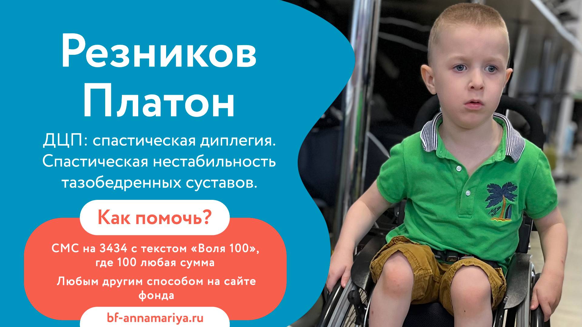 🆘 Платон, с рождения сражается за каждый день своей жизни. Но без вашей поддержки ему не справиться. Мальчику необходима операция, помогите! 🆘 Сразу же после рождения Резникову Платону был поставлен диагноз - ДЦП, вызванный внезапным увеличением уровня билирубина в организме и другими осложнениями. 👨🏻⚕️ Врачи днями и ночами боролись за его жизнь. К счастью малыша удалось спасти, и в 1,5 месяцев его выписали домой, но с множеством диагнозов...🏥 У мальчика до сих пор затруднения с самостоятельной ходьбой из-за проблем с ногами, однако он очень стремится к независимости! Для того чтобы научиться ходить самостоятельно, необходима специализированная операция SPML (метод чрежкожного миофасциального удлинения) . 🙏 Однако родители не в состоянии оплатить ее и обратились за помощью. Помогите Платону сделать первые шаги самостоятельно! 🙏 Как помочь? 🔵 отправьте СМС на номер 3434 с текстом «Воля 100» (где 100, любая сумма) 🔵 Сделайте пожертвование любым удобным способом по ссылке - https://bf-annamariya.ru/1750-reznikov-platon.html