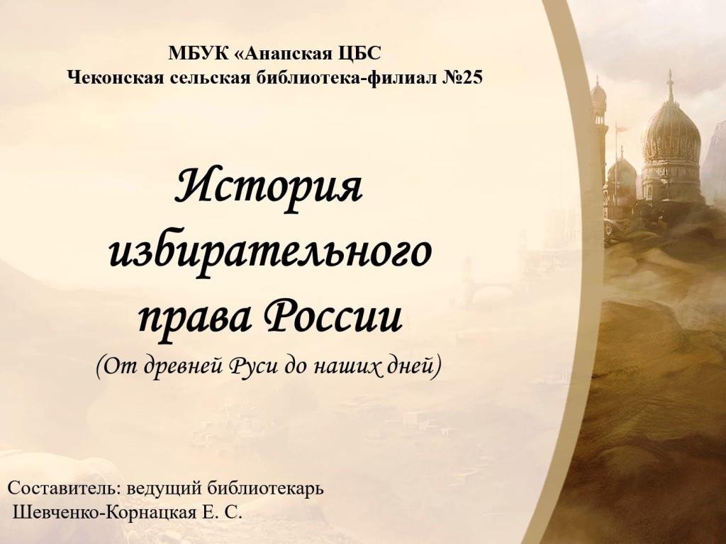 С древних времен на Руси существовали выборные традиции. Прежде всего, они выражались в т.н. вече (от общеславянского корня «Веть» - совет, собрание). Вечевой институт являлся формой проявления непосредственной демократии. Участниками веча могли быть «мужи» -— главы всех свободных семейств сообщества (племени, рода, поселения, княжества). Их права могли быть равными, но могли и различаться в зависимости от социального статуса. Вече созывалось для обсуждения и решения насущных вопросов общественной, политической и культурной жизни. Иногда на вече происходили выборы должностных лиц и даже призвание князей. Наибольшего развития вечевые традиции достигли в Новгородской и Псковской феодальных республиках в период XIII-XV веков С образованием централизованного российского государства (XV-XVI вв.) вече упраздняется. Но на общегосударственном уровне появляется новый законосовещательный орган - Земский собор. Он не был постоянно действующим, а созывался периодически для решения наиболее значимых вопросов (войны и мира, крупных реформ и др.). В период Смутного времени (при Ополчении) действовал Земский собор, который фактически превратился в высший орган власти и оставался таковым вплоть до избрания на царствие Михаила Фёдоровича Романова в 1613 г. Кстати, избрание произошло именно на Земском соборе. Список использованной литературы: 1. Веденин, Н.Н. Земельное право / Н.Н. Веденин. - М.: Юриспруденция; Издание 4-е, перераб. и доп., 2014. - 192 c. 2. Вернадский, Г.В. История права / Г.В. Вернадский. - М.: СПб: Лань, 2015. - 176 c. 3. Вискулова, В. В. Гарантии избирательных прав граждан: вопросы теории и практики / В.В. Вискулова. - М.: Издательство МГУ, 2015. - 296 c. 4. Водовозов, В.В. Всеобщее избирательное право на Западе / В.В. Водовозов. - М.: Книга по Требованию, 2015. - 255 c. 5. Воробьев, Н. И. Избирательное право Российской Федерации / Н.И. Воробьев. - М.: Дашков и Ко, 2015. - 288 c. 6. Всеобщее избирательное право / Коллектив авторов. - М.: Книга по Требованию, 2014. - 913 c. 7. Вы - землепользователь. Права, обязанности, условия, льготы. - М.: АСТ, 2016. - 352 c. 8. Выдрин, И.В. Избирательное право Российской Федерации / И.В. Выдрин. - Москва: Машиностроение, 2014. - 224 c. 9. Габричидзе, Б.Н. Административное право России / Б.Н. Габричидзе, А.Г. Чернявский. - М.: Велби; Издание 2-е, перераб. и доп., 2014. - 680 c. 10. Галлиган, Д. Административное право. История развития и основные современные концепции / Д. Галлиган, В.В. Полянский, Ю.Н. Старилов. - М.: ЮРИСТЪ, 2015. - 410 c. Подготовлено: МБУК «Анапская ЦБС» Чеконской сельской библиотекой-филиалом №25