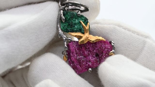 Кулон рубин (красный корунд) с плисовым малахитом 27*40мм.м408830