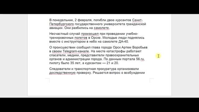 Молодые люди участвовали в учебно-тренировочных полетах.В понедельник, 2 февраля, погибли двое курсантов Санкт-Петербургского государственного университета гражданской авиации. Они разбились на самолете. Несчастный случай произошел при проведении учебно-тренировочных полетов в Орске. Молодые люди поднялись вместе с инструктором в небо на самолете ДА-40. О происшествии сообщил глава города Орск Артем Воробьев в своем Telegram-канале. На месте катастрофы работают спасатели, медики, представители правоохранительных органов и администрации города. По данным портала 56.ru, пилоту было 35 лет, а курсантам — 21 и 20.