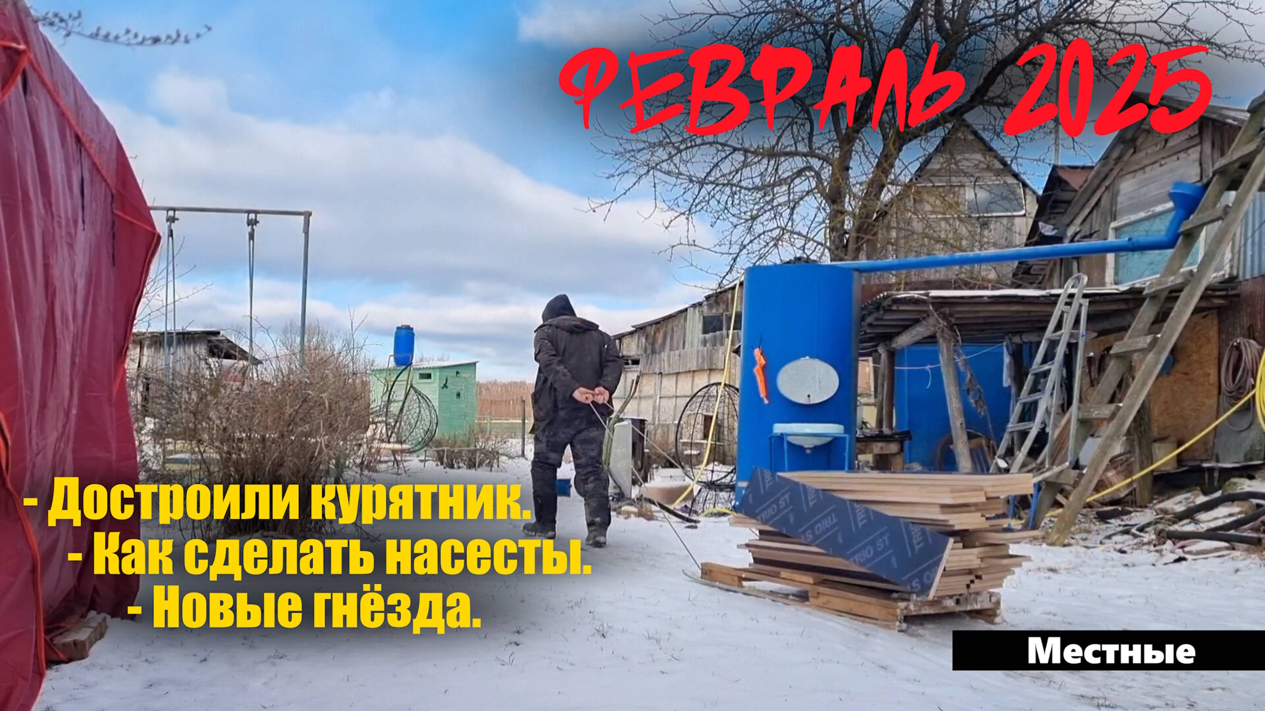 Февральские будни в деревне. - Достроили курятник. - Делаю новые гнёзда. - Где взять стройматериалы для насестов. Ещё видео можно посмотреть здесь: - https://t.me/lptnvlog - https://www.youtube.com/@mestnue - https://dzen.ru/mestnue 0:00 - Начало. 0:25 - Повседневные дела. 01:56 - Привёз фанеру. 03:12 - Новый шуруповёрт. 03:53 - Доделываю потолок и стены. 04:17 - Дверка для выгула. 07:12 - Потолок. 07:37 - Идём в лес за палками для насестов. 14:19 - Подготавливаю жерди. 16:18 - Делаю насесты. 19:29 - Собираю новые гнёзда в курятник. 22:57 - Примеряем гнёзда. 23:56 - Делаю кормушки. 26:30 - Ещё немного гнёзд. 27:15 - Монтируем гнёзда на место. 28:25 - Подставки для кормушек. 29:12 - Что в курятнике. 30:01 - Заселяю кур. 30:50 - Итог первых суток на новом месте. 31:31 - Строительная философия. 32:10 - Итоги февраля. 33:17 - Фото ловушки. 34:23 - Концовка. #лопатино, #лопатиноонлайн, #местные, #местные в деревне,