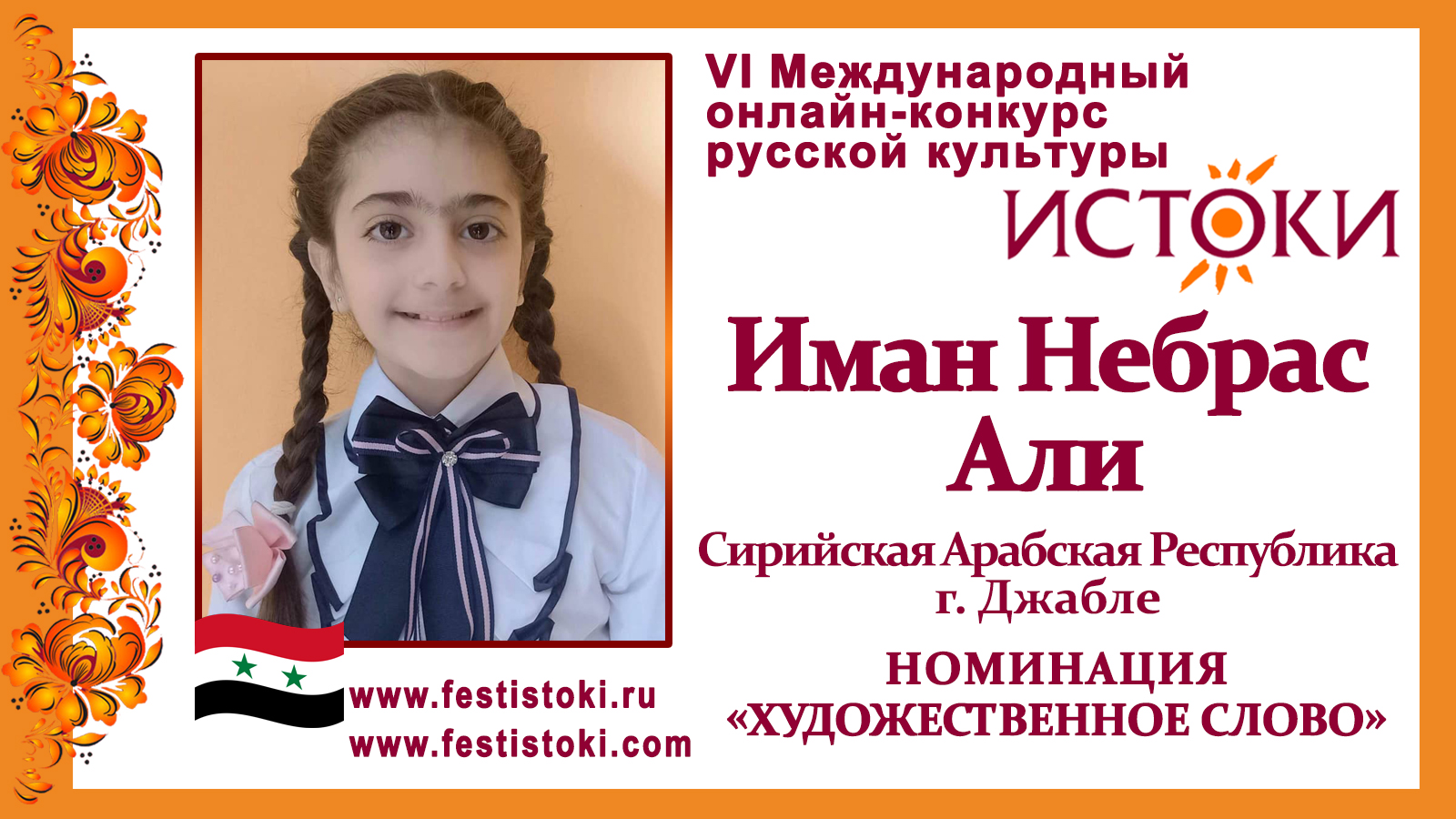 Иман Небрас Али, 10 лет. Сирия, г. Джабле. "А мне Россия навек люба"