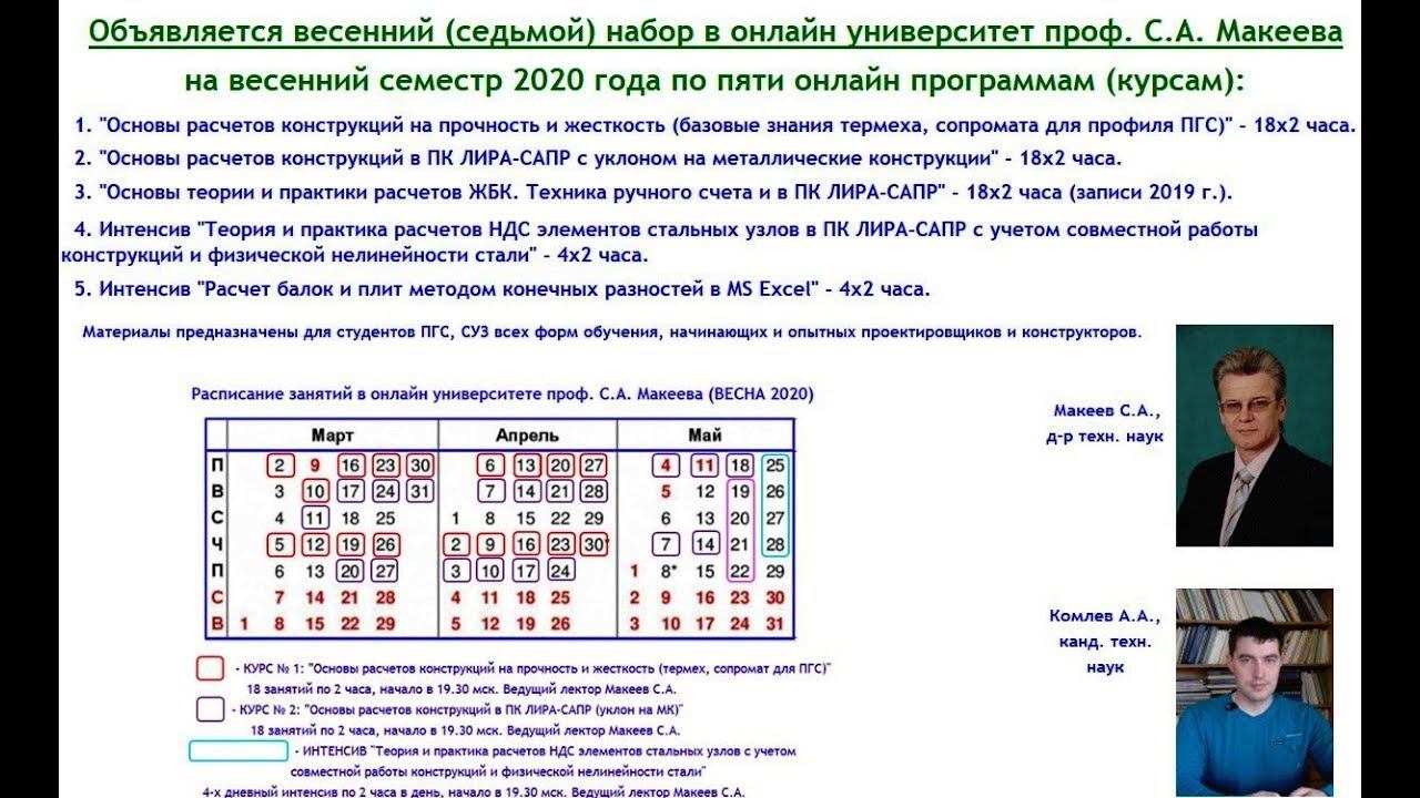 Официальный сайт онлайн университета https://sopromex.ru/ Закончены онлайн Курсы проф. С.А. Макеева: веснний семестр 2020 г. Приобрести записи онлайн занятий: https://makeev.justclick.ru/5kur_ves20. Бонусом прилагаются записи занятий осеннего семестра 2019 года. СОПРОМАТ, ЛИРА-САПР, ЖБК, РАСЧЕТ УЗЛОВ - это СИЛА!!! Я знаю, что студентам, проектировщикам, особенно начинающим, иногда не хватает профессиональных знаний и навыков расчетов конструкций на прочность и жесткость... Давайте восполним пробелы, освежим, освоим СОПРОМАТ, ЛИРА-САПР, ЖБК, расчеты стальных узлов в записи весеннего 2020 семестра. С уважением, С.А. Макеев, доктор технических наук, профессор https://sibadi.org/about/staff/635/ Официальный сайт онлайн университета https://sopromex.ru/