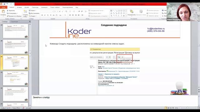 Компания «Кодерлайн» провела вебинар «Работа с задачами в 1С:Документооборот 3.0» Ведущая: Ненашева Мария Андреевна - эксперт в области ЭЦП и ЭДО Целевая аудитория Вебинар будет полезен сотрудникам, ответственным за внедрение и сопровождение системы на предприятии, пользователям системы. Описание Программа 1С:Документооборот 3.0 автоматизирует учет задач сотрудников в организации, работа с Задачами – это основа взаимодействия с системой всех пользователей. Чем лучше пользователь понимает как выстроена логика работы с задачами тем оперативнее сроки реакции, эффективнее исполнение процессов, в которых участвуют группы пользователей а значит и эффективнее работа всей организации. Программа 1. Единый инструмент для учета задач 2. Постановка задачи 3. Состояния задач 4. Автоматическое взятие в работу задач 5. Просмотр истории выполнения задачи 6. Ролевая адресация задач 7. Фактические исполнители задач 8. Отмена задачи 9. Удаление задачи 10. Отображение событий задач 11. Запрет выполнения задач из разных сеансов 12. Нумерация задач 13. Права доступа к задачам 14. Настройка уведомлений о задачах 15. Задачи и учет рабочего времени 16. Выполнение задач по почте 17. Вопросы по задаче