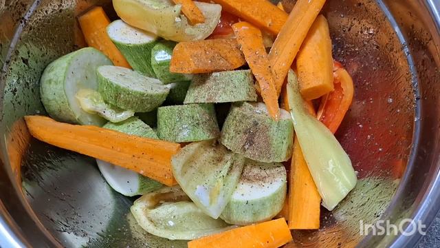 Это блюдо, вкусно подать в горячем виде, но многие любят в холодном. Ингредиенты: Кабачки-4-5шт молоденькие Перец сладкий красный 2шт длинный Перец сладкий болгарский 3шт Морковь 1шт Картофель 10шт молодой Специи-соль, чёрный свежемолотый перец, средиземноморские травы, острые приправы для овощей по вкусу. Масло растительное или оливковое 3-4ст.л.