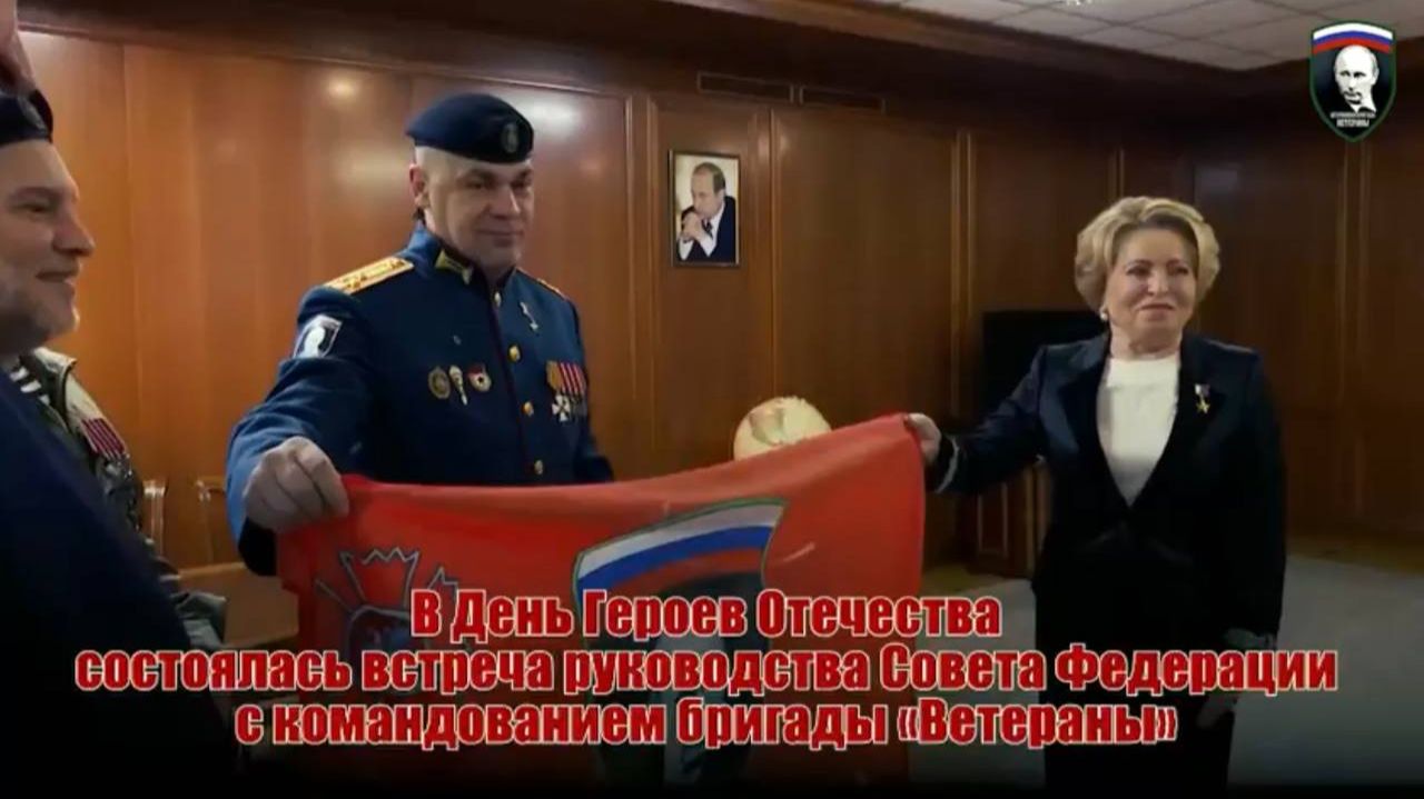 В День Героев Отечества состоялась встреча руководства Совета Федерации с командованием бригады «Ветераны». 9 декабря, в День Героев Отечества, Председатель Совета Федерации Валентина Матвиенко провела встречу с командованием разведывательно-штурмовой бригады «Ветераны» Добровольческого корпуса Минобороны России. Спикер СФ отметила, что это подразделение было создано в самые первые дни специальной военной операции. Валентина Матвиенко выразила восхищение мужеством и героизмом бойцов бригады, которые они демонстрируют ежедневно. «Искренняя благодарность вам за этот повседневный подвиг. Известно, что многие из вас удостоены высоких государственных наград. На вас равняется молодёжь. Как неоднократно подчёркивал Президент, вы — наша новая элита, золотой фонд страны. Все, кто защищает Россию в ходе СВО, — герои», — заявила она. В рамках встречи Председатель Совета Федерации вручила командиру бригады, Герою России Александру Тютереву, Благодарность от имени руководства СФ всему личному составу подразделения. Она также подчеркнула глубокое уважение российского общества ко всем участникам СВО и их семьям и внимание государства к их нуждам. Со своей стороны, командование бригады преподнесло Валентине Матвиенко флаг разведывательно-штурмовой бригады «Ветераны». Во встрече также принял участие заместитель Председателя Совета Федерации, Герой России Юрий Воробьёв. Наш Тelegram-канал: https://t.me/veterany_60omsb Наша группа ВКонтакте: https://vk.com/club214347861