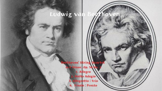Ludwig van Beethoven String Quartet I. String Quartet no. 7 in F major, op. 59 no. 1 1. Allegro 2. Allegretto vivace e sempre scherzando 3. Adagio molto e mesto 4. Thème Russe : Allegro II. String Quartet no. 8 in E minor, op. 59 no. 2 1. Allegro 2. Molto Adagio 3. Allegretto : Trio 4. Finale : Presto