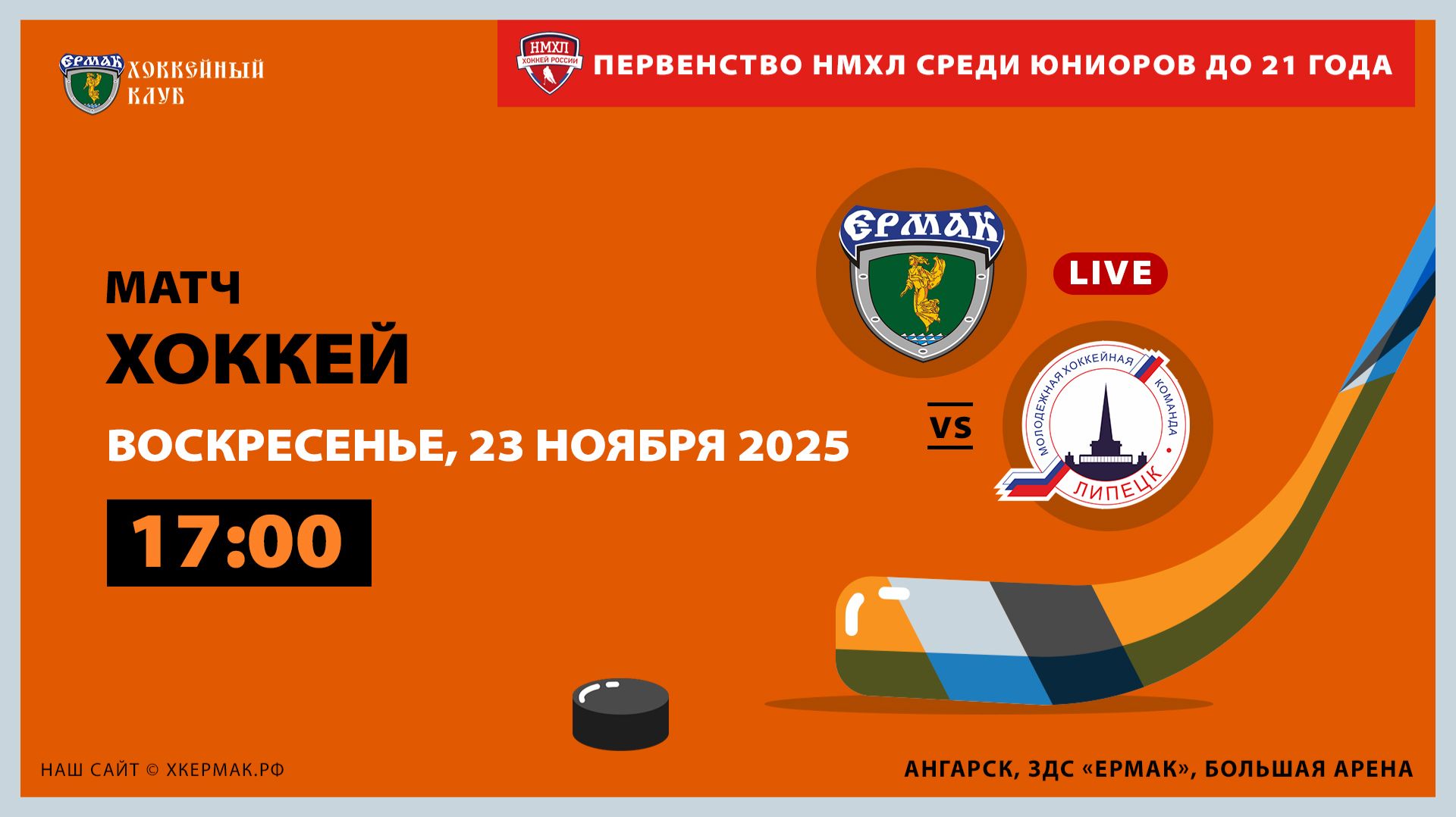 Матч между командами «Ермак» (Ангарск) и «Липецк» (Липецк, Липецкая область) в рамках Первенства Национальной молодёжной лиги среди юниоров до 21 года. Конференция «Восток». Первый этап. Сезон 2025/26 годов. 23 ноября 2025 года. Начало в 17-00. г. Ангарск, ЗДС «Ермак», большая арена