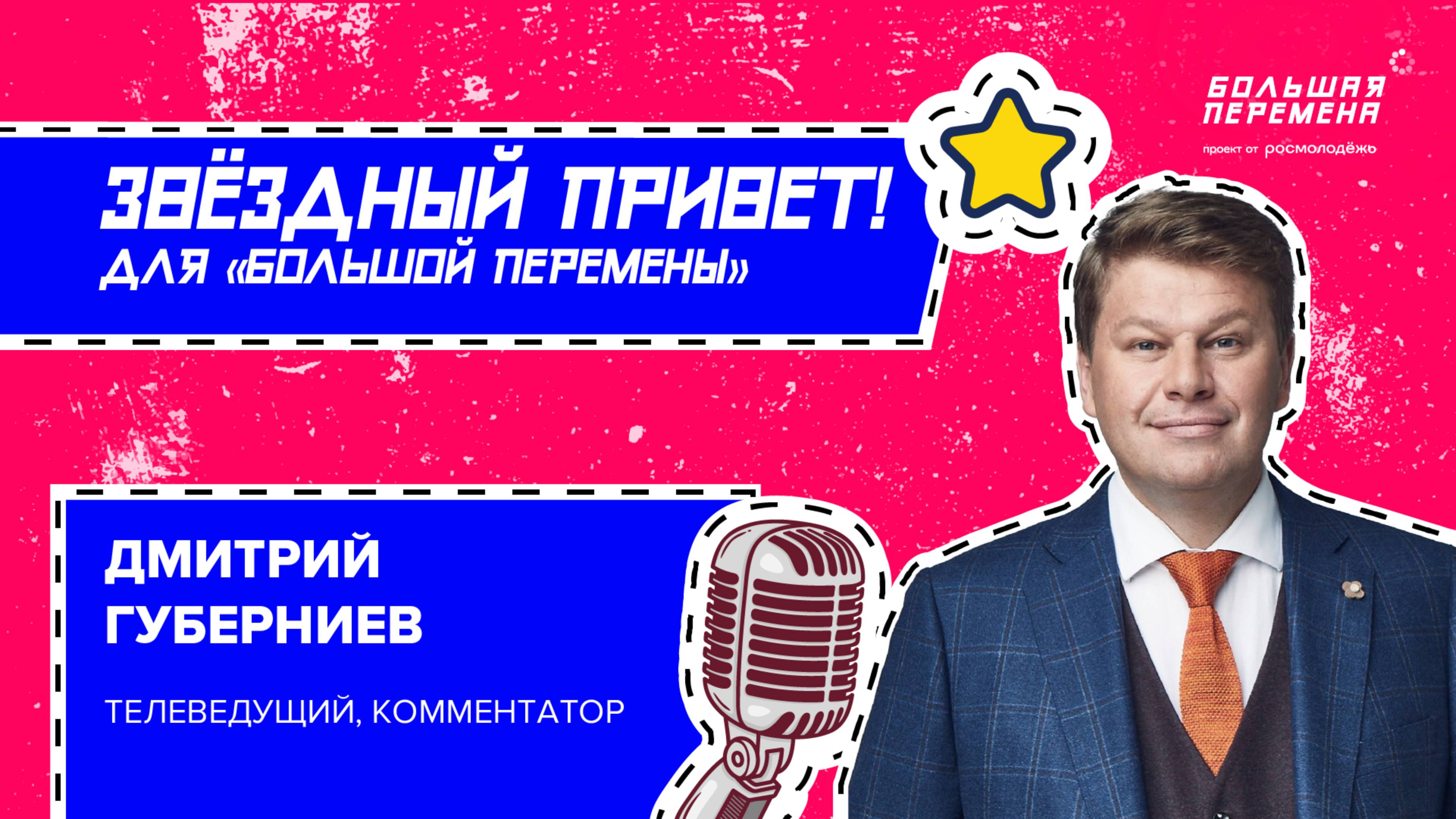 Неподражаемый комментатор Дмитрий Губерниев в своей фирменной манере шлёт всем участникам «Большой перемены» звёздный привет прямо с места съёмок нового проекта! А ещё Дмитрий Губерниев даёт полезный совет, который поможет тебе стать настоящим профессионалом в журналистике. Бери на вооружение! #БольшаяПеремена #РасскажиОГлавном