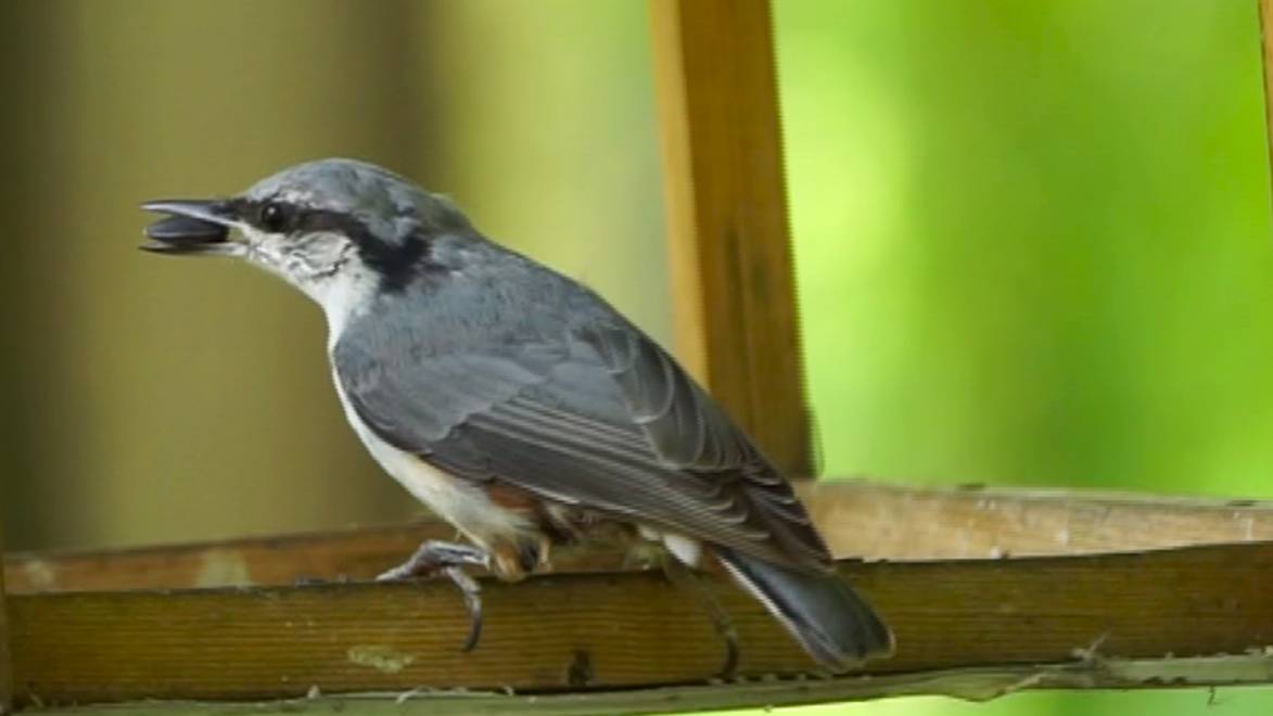 Синички и поползень в кормушке летом