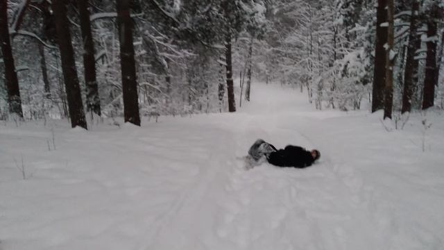 Спуск с снежной горы в сосновом Бору