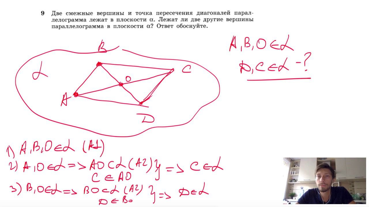 №9. Две смежные вершины и точка пересечения диагоналей параллелограмма лежат в плоскости α. Лежат ли две другие вершины параллелограмма в плоскости α? Ответ обоснуйте. Мой второй канал для подготовки к ЕГЭ и ОГЭ - https://www.youtube.com/ЕвгенийСумин Инстаграм - https://www.instagram.com/EGE_OGE.math Личный инстаграм - https://www.instagram.com/ee_sumin VK - https://vk.com/evgeniysumin FB - https://www.facebook.com/EvgeniySumin