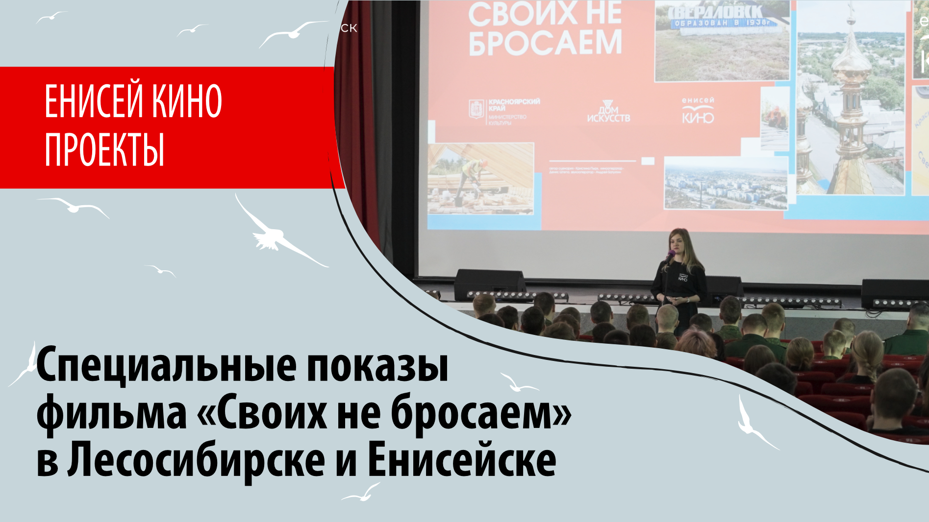 В Лесосибирске и Енисейске. прошли специальные показы документального фильма «Своих не бросаем» (2022, реж. Владимир Сыргашев), посвящённого социально-экономическому восстановлению города Свердловска и Свердловского района Луганской Народной Республики при участии Красноярского края. Производством занималась съемочная группа «Енисей кино». После показов зрители обсуждали картину с творческой командой, работавшей над фильмом Съёмки фильма состоялись при поддержке Правительства и министерства культуры Красноярского края. Показы осуществлялись в рамках проекта «Киноглаз».