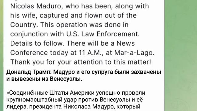 «Соединённые Штаты Америки успешно провели крупномасштабный удар против Венесуэлы и её лидера, президента Николаса Мадуро, который вместе со своей супругой был захвачен и вывезен из страны. Эта операция была проведена совместно с правоохранительными органами США. Подробности последуют. Сегодня в 11:00 в Мар-а-Лаго состоится пресс-конференция. Благодарю за ваше внимание к данному вопросу!» — написал президент США.