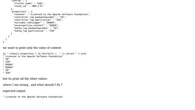 Unix & Linux: jq + how to print only the value of key under properties Helpful? Please support me on Patreon: https://www.patreon.com/roelvandepaar With thanks & praise to God, and with thanks to the many people who have made this project possible! | Content (except music & images) licensed under cc by-sa 3.0 | Music: https://www.bensound.com/royalty-free-music | Images: https://stocksnap.io/license & others | With thanks to user yael (https://unix.stackexchange.com/users/237298), user pLumo (https://unix.stackexchange.com/users/236063), user Jeff Schaller (https://unix.stackexchange.com/users/117549), and the Stack Exchange Network (http://unix.stackexchange.com/questions/460059). Trademarks are property of their respective owners. Disclaimer: All information is provided "AS IS" without warranty of any kind. You are responsible for your own actions. Please contact me if anything is amiss at Roel D.OT VandePaar A.T gmail.com.