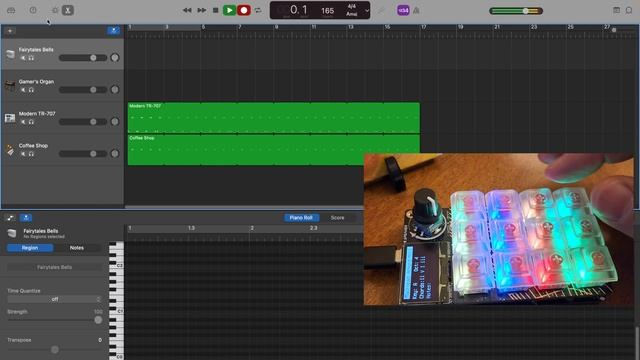 GarageBand for MacOS can quickly construct songs from live instruments, samples, and of course MIDI controllers. Here we will build an 80's song intro in under four minutes using the Macropad 4chord MIDI as a drum pad AND as a chord generator. We can even build a melody line on the first try by using the triads of our harmony! See https://github.com/deckerego/Macropad_4chord_MIDI for more details, including how to build your own.