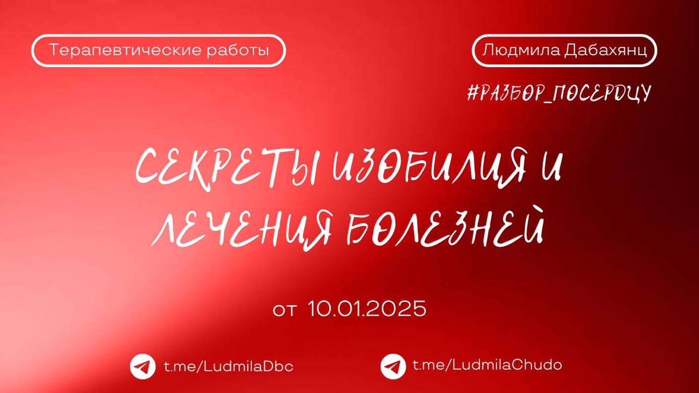 Запись эфира #разбор_поСердцу Секреты изобилия и лечения болезней 💫Полный эфир здесь: 👉🏻https://rutube.ru/video/71c7b2df652769f5ae52e767b4c4e991/ ‼️ до встречи на следующей неделе, успевайте отправить заявку на участие в разборе, заявки на разбор принимаются здесь - https://t.me/ludmiladbc_bot ‼️ канал #твАрец_реальности 2025 Подробнее: https://rutube.ru/video/2744940f7bab3063b818c926b2253dfc/ О канале: https://t.me/chatLudmilaChudo/4310 Заходите в бот - https://t.me/ludmiladbc_bot , если хотите участвовать Теперь в одном месте ты можешь посмотреть: ✔️ чем я могу быть для тебя и... ✔️ что я могу дать тебе Переходи: https://t.me/ludmiladbc_bot ✓ Обязательно поставь 💗 ✓ Подпишись на канал ✓ И поделись с близкими Это будет вашим балансом за движение и получение энергии. Если есть желание создать баланс брать-давать... приму от всего сердца с благословением (донейшн). С Огромной Любовью, Дабахянц Людмила 💓 ✨ Telegram: https://t.me/ludmiladbc ✨ Канал в telegram “Я ЕСТЬ”: https://t.me/LudmilaChudo ✨Мой бот в telegram: https://t.me/ludmiladbc_bot ✨Онлайн-школа: https://ludmilachudo.skillspace.ru/school ✨Rutube: https://rutube.ru/channel/34371568/