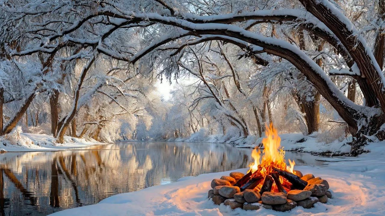 Атмосфера Зимы. Приятные звуки Костра и Воды.