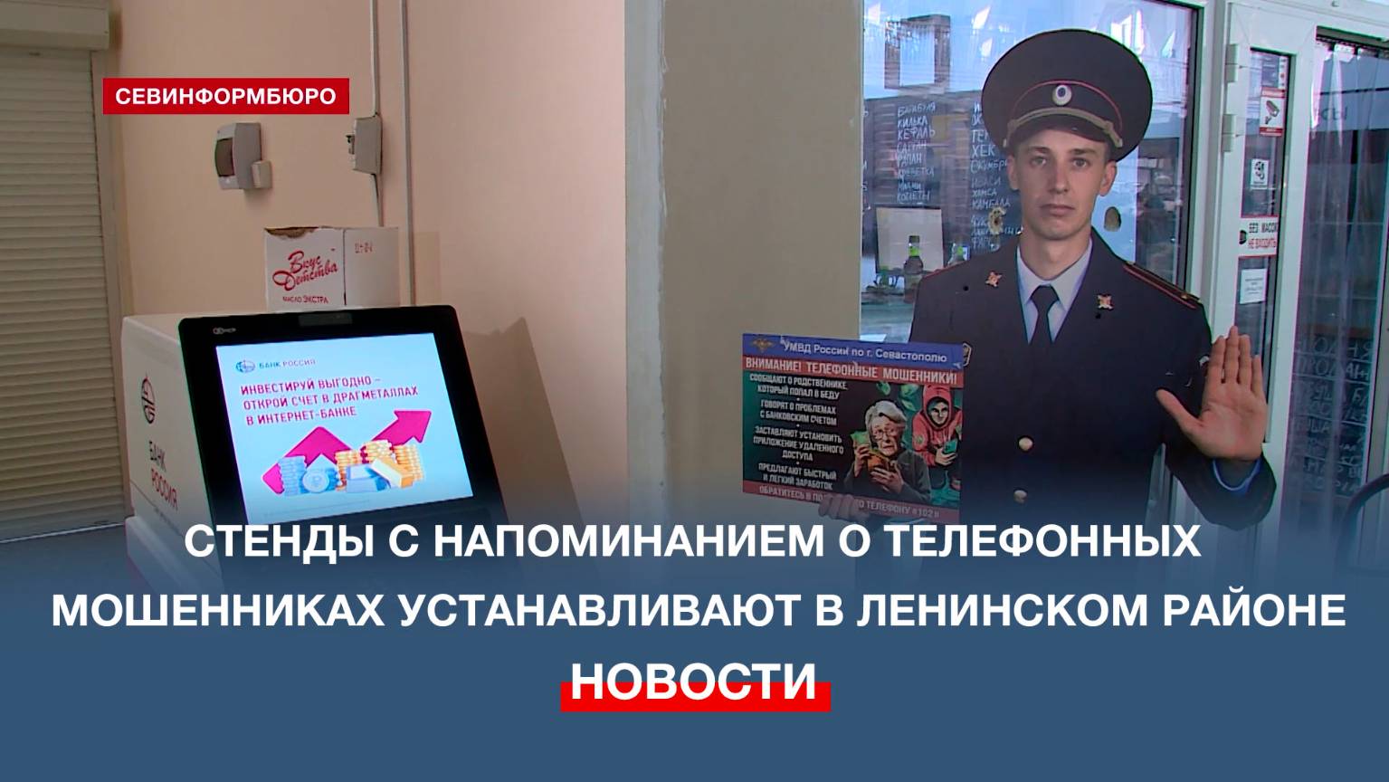 Около банкоматов и в местах скопления людей в Ленинском районе Севастополя жителям города будут напоминать о действиях дистанционных мошенников. Эту задачу поручили ростовым фигурам – полицейским, которые держат в руках информационные таблички. Один из стендов установили в здании Пассажа Центрального рынка. Подписывайтесь на наш Телеграм-канал: https://t.me/nts_novosti Смотрите новости Севастополя и Крыма на сайте НТС: http://nts-tv.com В нашей группе "ВКонтакте": https://vk.com/ntssevastopol На странице в "Одноклассниках": https://ok.ru/ntssevastopol