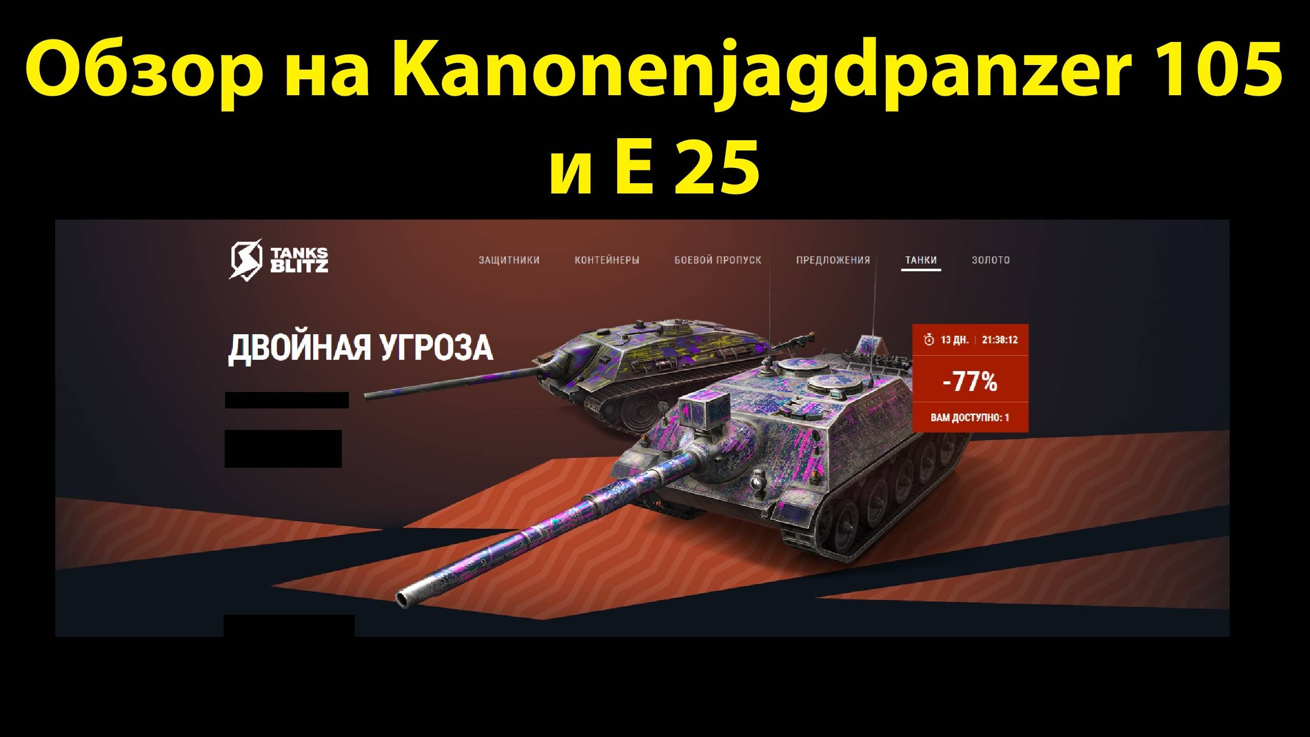 В этом видео я рассказываю о танках Kanonenjagdpanzer 105 и E 25, которые появились в продаже за золото и реальный прайс в игре Tanks Blitz. ✅TanksBlitz Обзоры танков (плейлист): https://rutube.ru/plst/445862/ ✅Мой канал ВКонтакте: https://vk.com/oneshot_play1 ✅Мой канал на YouTube: https://www.youtube.com/@OneShot_Play ✅Мой второй канал по играм: https://rutube.ru/channel/41302499/ Ставьте лайки, рассказывайте друзьям и обязательно комментируйте! =) #wotblitz#tanksblitz#вотблитц#танкблитц#обзортанка#обзор