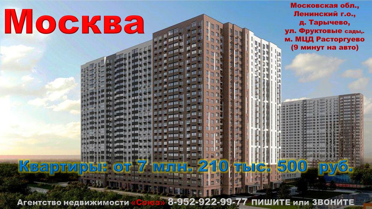 Подпишитесь на нас. Благодарим !!! https://www.youtube.com/@nedvigimoct/videos - мы на Ютубе https://dzen.ru/nedvigimoct?tab=longs&utm_referrer=dzen.ru - мы на Дзене https://rutube.ru/channel/27083000/videos/ - мы на Рутубе https://vk.com/club223108371 Агентство недвижимости «СОЮЗ» Покупайте: квартиру в Москве. Московская обл., Ленинский г.о., д. Тарычево, ул. Фруктовые сады,. м. МЦД Расторгуево (9 минут на авто) Агент по новостройкам: 89529229977 (WhatsApp) Заплатим за вас первоначальный взнос или вернем кешбэк в размере первоначального взноса по ипотеке за 60 дней. Акция распространяется на ограниченный список квартир и не суммируется с другими скидками и спецпредложениями. В ней участвуют только квартиры от застройщика. Цены на квартиры точно такие же как и у застройщика. Квартиры продаются БЕЗ РИЭЛТОРСКОЙ КОМИССИИ !!!. Ст. квартиры: от 7 млн. 210 тыс. 500 руб. Ежемесячный платеж: 34 541 руб. при ставке 6% Площадь общая: 25,2 м2 - 25,3 м2 1к. квартиры: от 8 млн. 410 тыс. 800 руб. Ежемесячный платеж: 40 291 руб. при ставке 6% Площадь общая: 33,9 м2 - 42,2 м2 2к. квартиры: от 11 млн. 169 тыс. 495 руб. Ежемесячный платеж: 53 506 руб. при ставке 6% Площадь общая: 52,2 м2 - 68,4 м2 3к. квартиры: от 12 млн. 945 тыс. 906 руб. Ежемесячный платеж: 62 016 руб. при ставке 6% Площадь общая: 62,8 м2 - 84,2 м2 Срок сдачи: 3 кв. 2025 - 2 кв. 2026 Срок выдачи ключей: 1 кв. 2026 - 4 кв. 2026 Договор: ДДУ Тип дома: кирпично-монолитный Тип отделки: подготовка под чистовую отделку Парковка: подземная Потолки: 2,84 м. Преимущества:Транспортная доступность. Развитая инфраструктура. Собственные детские сады и школы. Разнообразие планировок. Система "Умный дом". Описание комплекса: Жилой комплекс находится в Ленинском городском округе МО, всего в 1 км от МКАД. Расположение можно назвать удачным за счет транспортной доступности и близости к природным объектам. С севера и запада находится лес. Южные соседи квартала – малоэтажные частные дома, не закрывающие виды на горизонт из окон. К востоку от квартала проходит Старо-Нагорная улица с гипермаркетом Лента. Действующая ж/д станция Булатниково (в перспективе будущая МДЦ D5) в пешей доступности, всего 10-12 минут. Удобный выезд на трассу М4-Дон в сторону Москвы и области – 850 м, а также до МКАД в пределах 1 км. Ландшафтный дизайн и богатое озеленение представляют единое гармоничное пространство. Изюминка проекта - пешеходный бульвар-дендрарий, совсем как на южном курорте. Он идеален для семейных прогулок. По сторонам прогулочной зоны разместились точки для самых разнообразных активностей. Центральная площадь на бульваре предназначена для проведения всесезонных мероприятий, объединяющих жильцов. Другие центры притяжения квартала - спортивные площадки и сквер с игровым оборудованием у детского сада. На детских площадках преобладают сочные цвета южных фруктов, которые прекрасно гармонируют с зеленью и песочным тоном покрытий. Собственные 3 детских сада и 2 большие школы буквально «под окнами» помогут избегать стрессов со сборами и дорогой по утрам. К тому же этот короткий и безопасный путь школьники начинают проделывать самостоятельно с младших классов. Фасады разработаны известным архитектором Рустамом Керимовым, с применением стратегии от испанского бюро Citythinking. Фасады разрабатывались с учетом логики восприятия с разных точек их видимости, долговечности материалов и функциональных требованиям к окнам и лоджиям. Секции-маяки формируют у зданий визуальную L-форму, что добавляет зданиям структур