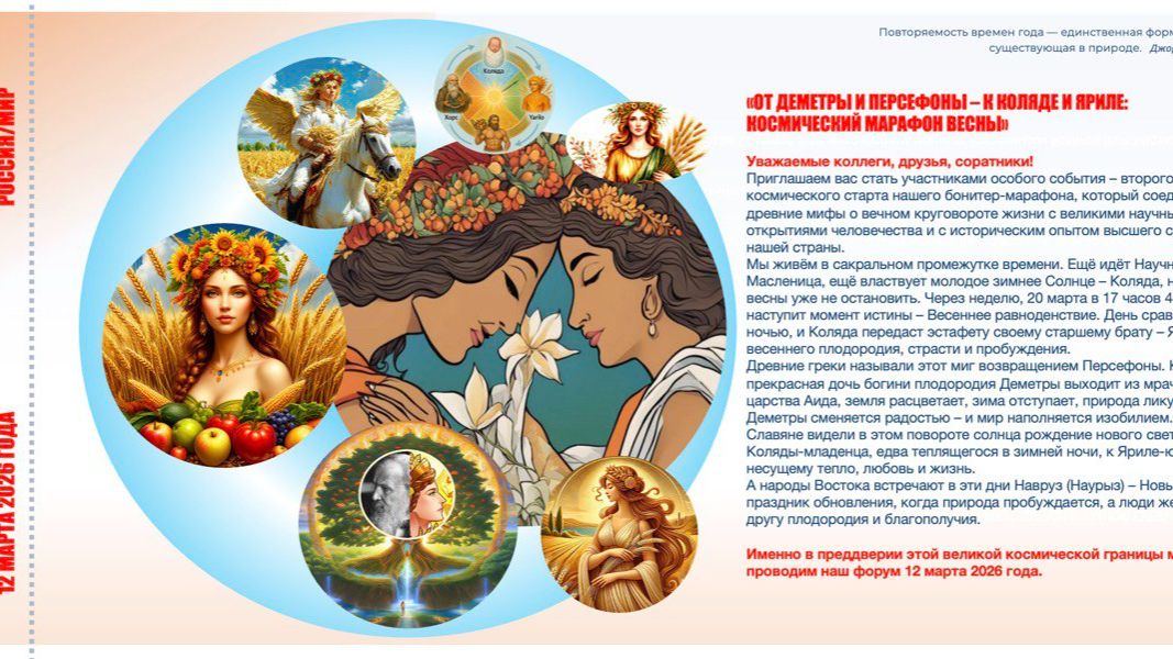 «ОТ ДЕМЕТРЫ И ПЕРСЕФОНЫ – К КОЛЯДЕ И ЯРИЛЕ: КОСМИЧЕСКИЙ МАРАФОН ВЕСНЫ» Уважаемые коллеги, друзья, соратники! Приглашаем вас стать участниками особого события – второго космического старта нашего бонитер-марафона, который соединяет древние мифы о вечном круговороте жизни с великими научными открытиями человечества и с историческим опытом высшего суверенитета нашей страны. Мы живём в сакральном промежутке времени. Ещё идёт Научная Масленица, ещё властвует молодое зимнее Солнце – Коляда, но дыхание весны уже не остановить. Через неделю, 20 марта в 17 часов 46 минут, наступит момент истины – Весеннее равноденствие. День сравняется с ночью, и Коляда передаст эстафету своему старшему брату – Яриле, богу весеннего плодородия, страсти и пробуждения. Древние греки называли этот миг возвращением Персефоны. Когда прекрасная дочь богини плодородия Деметры выходит из мрачного царства Аида, земля расцветает, зима отступает, природа ликует. Скорбь Деметры сменяется радостью – и мир наполняется изобилием. Славяне видели в этом повороте солнца рождение нового света: от Коляды-младенца, едва теплящегося в зимней ночи, к Яриле-юноше, несущему тепло, любовь и жизнь. А народы Востока встречают в эти дни Навруз (Наурыз) – Новый день, праздник обновления, когда природа пробуждается, а люди желают друг другу плодородия и благополучия. ПОЧЕМУ 12 МАРТА – ОСОБАЯ ДАТА? Этот день – второй мартовский космический старт нашего марафона, который продлится до 12 апреля – Международного дня космонавтики. 12 марта мы отдаём дань памяти и восхищения тем, кто расширил границы человеческого познания: Александр фон Гумбольдт – ровно 197 лет назад, в 1829 году, началось его легендарное путешествие по Российской империи, открывшее миру природу Урала, Сибири и Каспия; Их имена стоят в одном ряду с теми, кому посвящён наш марафон: 180-летие Василия Васильевича Докучаева – певца русской степи; Подвиг Юрия Алексеевича Гагарина – крестьянского сына, шагнувшего в космос; Наследие Владимира Ивановича Вернадского – мыслителя о живом веществе и ноосфере; Год пастбищных угодий и степных трав (ООН-2026); И конечно, светлый праздник 8 Марта, когда мы славим женщин – наших Деметр и Персефон, хранительниц жизни и вдохновительниц.ОСОБЫЙ АНАЛИТИЧЕСКИЙ И ПАТРИОТИЧЕСКИЙ КОНТЕКСТ Дорогие друзья! Сегодня, когда идёт 13-й день новой критической фазы гибридной войны, развязанной против Ирана Китая России (эскалация с 28 февраля 2026 года), наш форум обретает особое звучание. Мы собираемся для разговора о великом наследии не в безвоздушном пространстве академической абстракции, а в момент, когда противник бросил вызов самому нашему праву на существование. И в этом контексте обращение к истории Советского Союза как военной мегакорпорации, обладавшей высшим политическим, технологическим и научно-образовательным суверенитетом, становится не просто данью памяти, а инструментом интеллектуальной мобилизации. Вспомним вехи большого пути: КЕПС (Комиссия естественных производительных сил) – созданная Вернадским ещё в 1915 году, она стала прообразом всех будущих плановых органов, научившись считать ресурсы страны – от полезных ископаемых до «живого вещества». ГОЭЛРО и Госплан – превратили науку в инженерию будущего, заложив основы пятилетнего планирования. Первые пятилетки – индустриализация, со