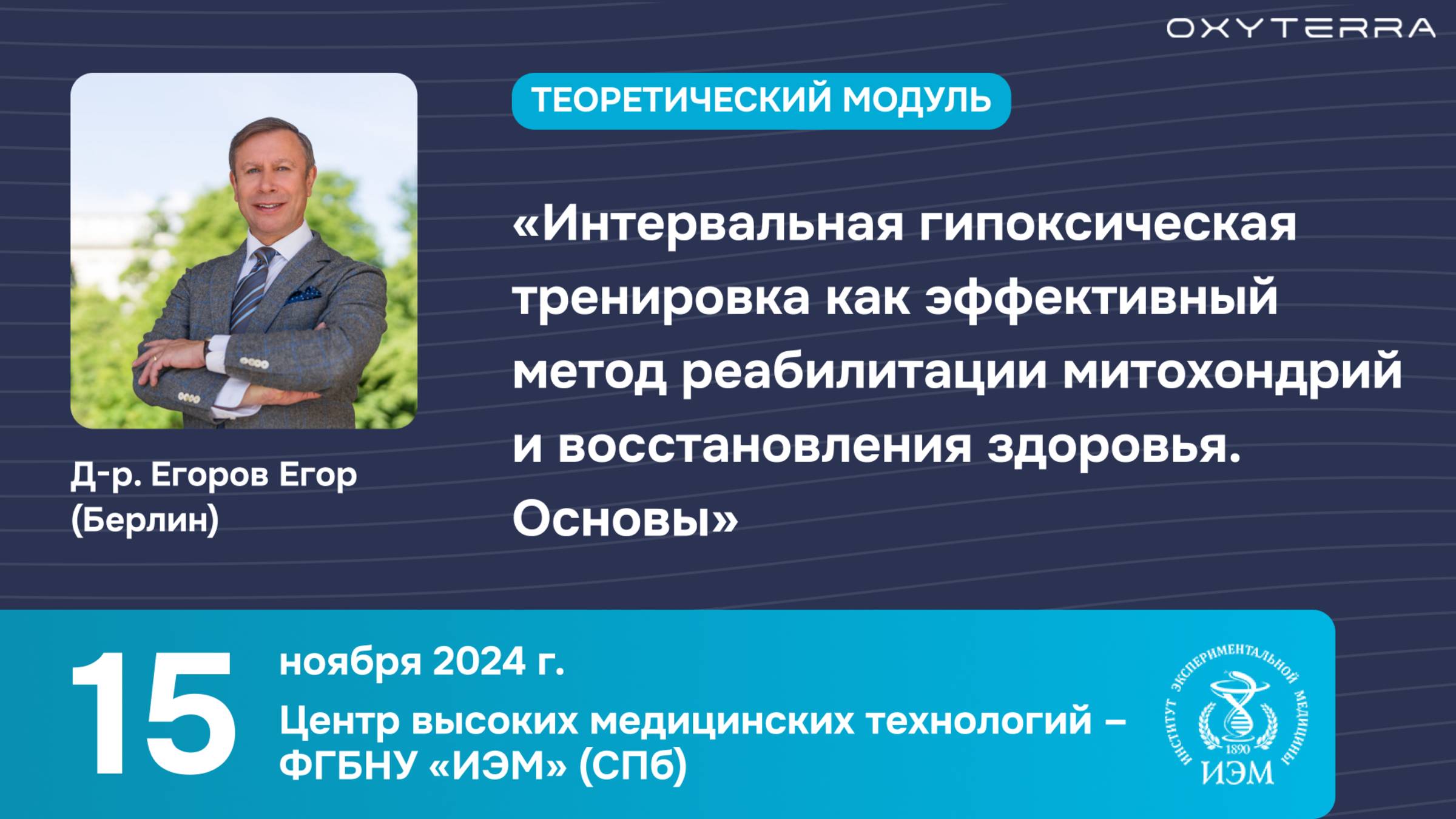Доклад доктора Егора Егорова (Берлин) на тему "Интервальная гипоксическая тренировка как эффективный метод реабилитации митохондрий и восстановления здоровья. Основы". (Часть 1: теоретическая). Центр высоких медицинских технологий Федерального бюджетного научного учреждения «Институт экспериментальной медицины» в Санкт-Петербурге принял практикующих врачей различных специальностей на уникальной научной сессии с обучающим модулем по методике интервальной гипокси-гипероксической тренировки (ИГТ). Сессию провел доктор Егор Егоров. Он не только рассказал о специфике метода интервальных гипоксических тренировок (ИГТ), но и поделится своим многолетним опытом применения ИГТ в профилактике и лечении различных заболеваний. О спикере: Егор Егоров (Берлин) – специалист с более чем 40-летним врачебным стажем (20 из которых — в области гипокситерапии), Президент международного общества по поддержке научных исследований в области интервальных гипоксических тренировок «InterHypox e.V.», к.м.н., международный референт в области интервальной гипоксии и специалист в области митохондриальной медицины. Телеграм-канал доктора Е. Егорова: t.me/doc_egor_egorov Дата: 15 ноября 2024 года, в 12:00 Место проведения: г. Санкт-Петербург, Малый пр-т ПС, д. 13 (Центр высоких медицинских технологий Федерального бюджетного научного учреждения «Институт экспериментальной медицины»). ====================================================== Больше методической литературы и научных статей по методу интервальной гипокси-гипероксической тренировки на инновационном аппарате OXYTERRA направим вам по запросу на info@oxyterra.ru Официальный сайт производителя: www.oxyterra.ru #oxyterra #oxiterra #окситерра #гипокситерапия #гипоксигиперокси #ггт #игт #медицинскоеоборудование #дыхание #физиотерапия #реабилитация #восстановление #митохондрии #доктор_егоров