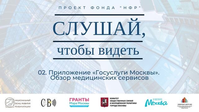 Вашему вниманию предлагается второй выпуск информационно-просветительского проекта «Слушай, чтобы видеть. Городские инновации», направленного на аудиторию незрячих пользователей электронной техники столичного региона. Проект реализуется «Национальным фондом развития реабилитации» при поддержке Грантов Мэра Москвы для социально ориентированных НКО Комитета общественных связей и молодежной политики города Москвы. Эпизод посвящен обзору популярных медицинских сервисов в приложении «Госуслуги Москвы». Ведущие подкаста Всеволод Попов и Василий Дрожжин описывают как прикрепиться к медицинскому учреждению, записаться к врачу, оформить доступ к электронной медицинской карте… В выпуске присутствует демонстрация функционала мобильного приложения с использованием программы экранного доступа Voiceover под iOS. Сайт мэра и правительства Москвы: https://mos.ru Ссылка на приложение "Гос услуги Москвы" в магазине App Store: https://apps.apple.com/ru/app/%D0%B3%D0%BE%D1%81%D1%83%D1%81%D0%BB %D1%83%D0%B3%D0%B8-%D0%BC%D0%BE%D1%81%D0%BA%D0%B2%D1%8B/id566254786