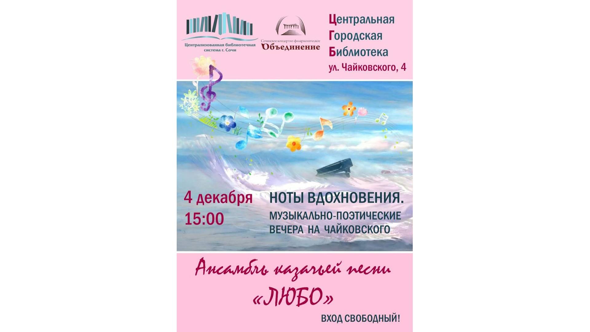 Ноты вдохновения. Музыкально-поэтические вечера на Чайковского. Проект музыкально-поэтические вечера на Чайковского "Ноты вдохновения" набирает обороты. На этот раз в читальном зале центральной городской библиотеки выступил Ансамбль казачьей песни «Любо». О том, как прошёл концерт, смотрите в нашем репортаже. Все самые свежие новости, интересные события, книжные новинки – на нашем сайте https://library-sochi.ru/ на нашей официальной странице ВКонтакте (Сообщество) — https://vk.com/club211756065 в наших Телеграмм-каналах: https://t.me/librarySochi и https://t.me/biblioteka_na_chaykovskogo Подписывайтесь на наш канал «ЦБС города Сочи» в RuTube!!! https://rutube.ru/channel/23714704/ Все права на использованные материалы сохраняются за правообладателями. https://library-sochi.ru/ #Музыка #КазачьяПесня #АнсамбльЛюбо #АнсамбльКазачьейПесниЛюбо #КазачьиПесни #Песня #Песни #Книга #Книги #Книжка #Книжки #МояКнига #КнигиДетям #Дети #Детей #Детство #ДетиРоссии #История #Истории #Интересно #Библиотека #Библиотеки #ИдуВбиблиотеку #СочиНачинаетсяСсемьи #Читаемвсейсемьей #Читаемвсейсемьёй #Читаемвсейсемьей2024 #Читаемвсейсемьёй2024 #ЧитайтеИразвивайтесь #ПартнерствоБиблиотек_цбсСочи #КнижкаОткрывается_ЧудоНачинается #КультурноеНаследиеКубани_цбсСочи #КультурноеНаследиеРоссии #КультурноеНаследиеКубани #КультурноеНаследие #НароднаяКультураДляШкольников #НароднаяКультураДляШкольников_цбсСочи #ЦентрализованнаяБиблиотечнаяСистемаСочи #БиблиотечнаяСистемаСочи #ЦентральнаяГородскаяБиблиотекаСочи #ЦентральнаяБиблиотекаСочи #ГородскаяБиблиотекаСочи #БиблиотекаНаЧайковского #КультураДляШкольников_цбсСочи #КультураДляШкольников2024 #КультураДляШкольников #ЧитаемСудовольствием #КультураСочиОнлайн #ЧитаемСинтересом #ВремяЧитать_цбсСочи #ЧитаемДетям #ЧитаемДома #КультураРФ #КультураСочи #Культура_Кубани #ЦБССочи #БиблиотекиРоссии #ДетскиеБиблиотекиСочи #БиблиотекиСочи #Библиотеки_Кубани #ЧитатьМодно #ЧтоПочитать #Книголюб #ВремяЧитать #Читаем #Сказки #Стихи #Книга #ЧитатьСказки #ЧитайИпомни #МыСлужимКниге
