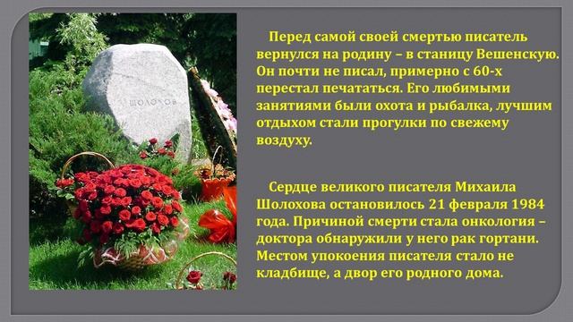 Виртуальная выставка посвящена 120-летию со дня рождения великого русского писателя Михаила Александровича Шолохова. В произведениях Михаила Шолохова отражены важнейшие, решающие этапы истории советского общества.