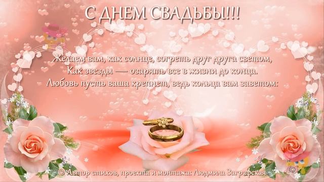 С днем свадьбы! Совет да любовь вам! В проекте прозвучала песня «Blagodaryu_Anna_Makovetskaya_minus» с сайта http://fonki.pro/ © Автор стихов,проекта и монтажа: Людмила Заграфская Это видео (на мои стихи) вы можете посмотреть на моих авторских каналах: - Ютуб «Людмила Заграфская» без моих стихов: https://youtu.be/2fOzWriqQ1A - Дзен «Людмила Заграфская»: https://dzen.ru/video/watch/676bfd0465c0ec5e94b8d6ec